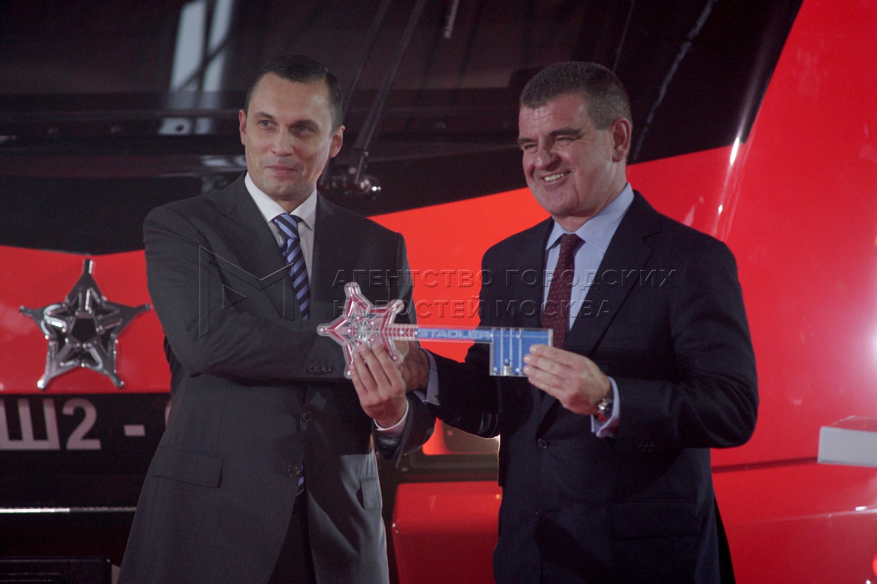 • Описание: Гендиректор компании Stadler Rail Group Петер Шпулер (справа) в момент передачи символического ключа от первого двухэтажного аэроэкспресса гендиректору компании «Аэроэкспресс» Алексею Криворучко.