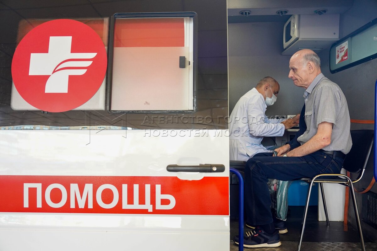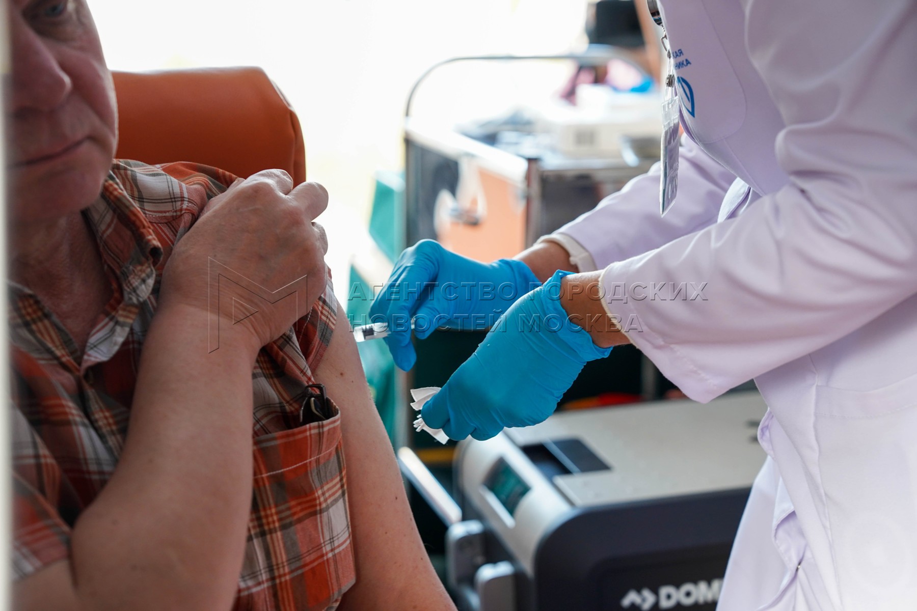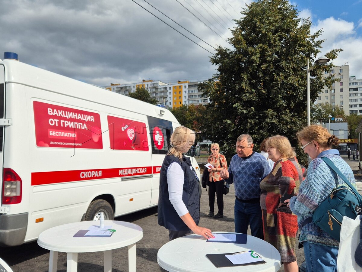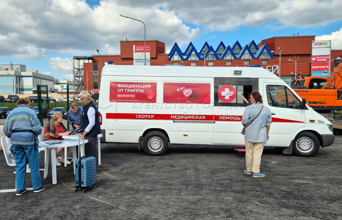Работа мобильного пункта вакцинации от гриппа у станции метро «Речной вокзал» в М...