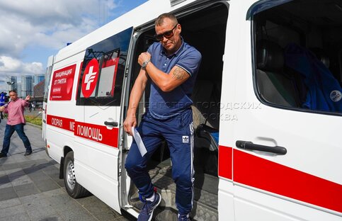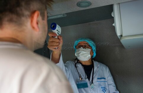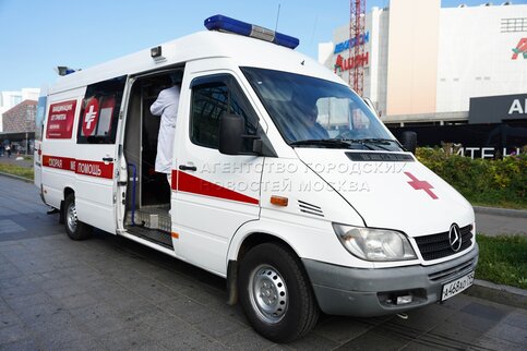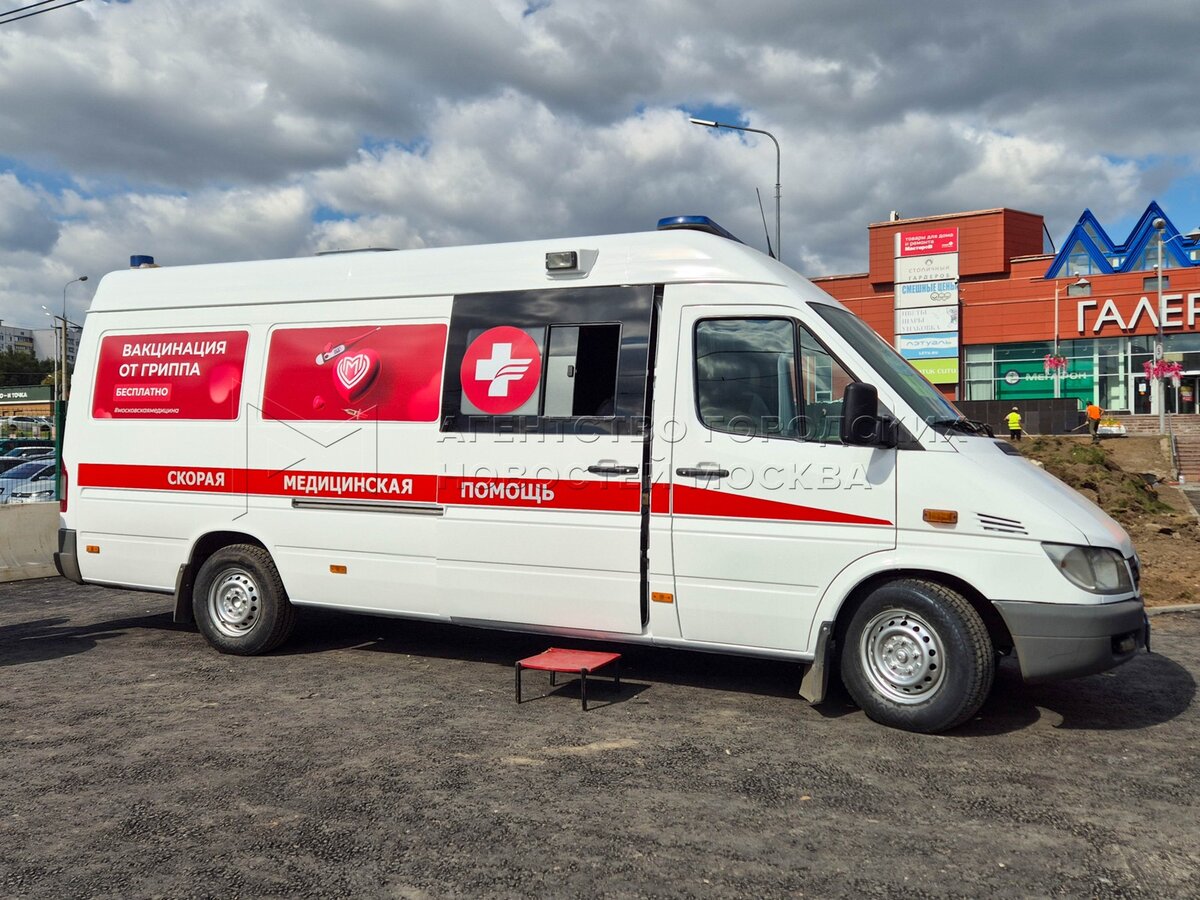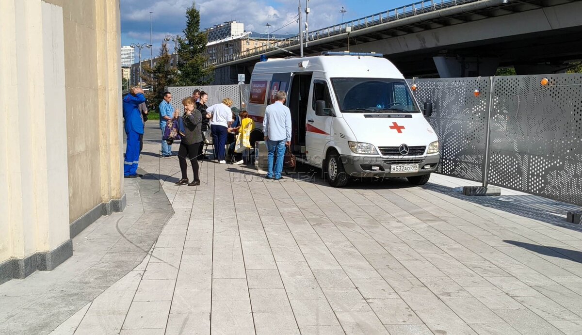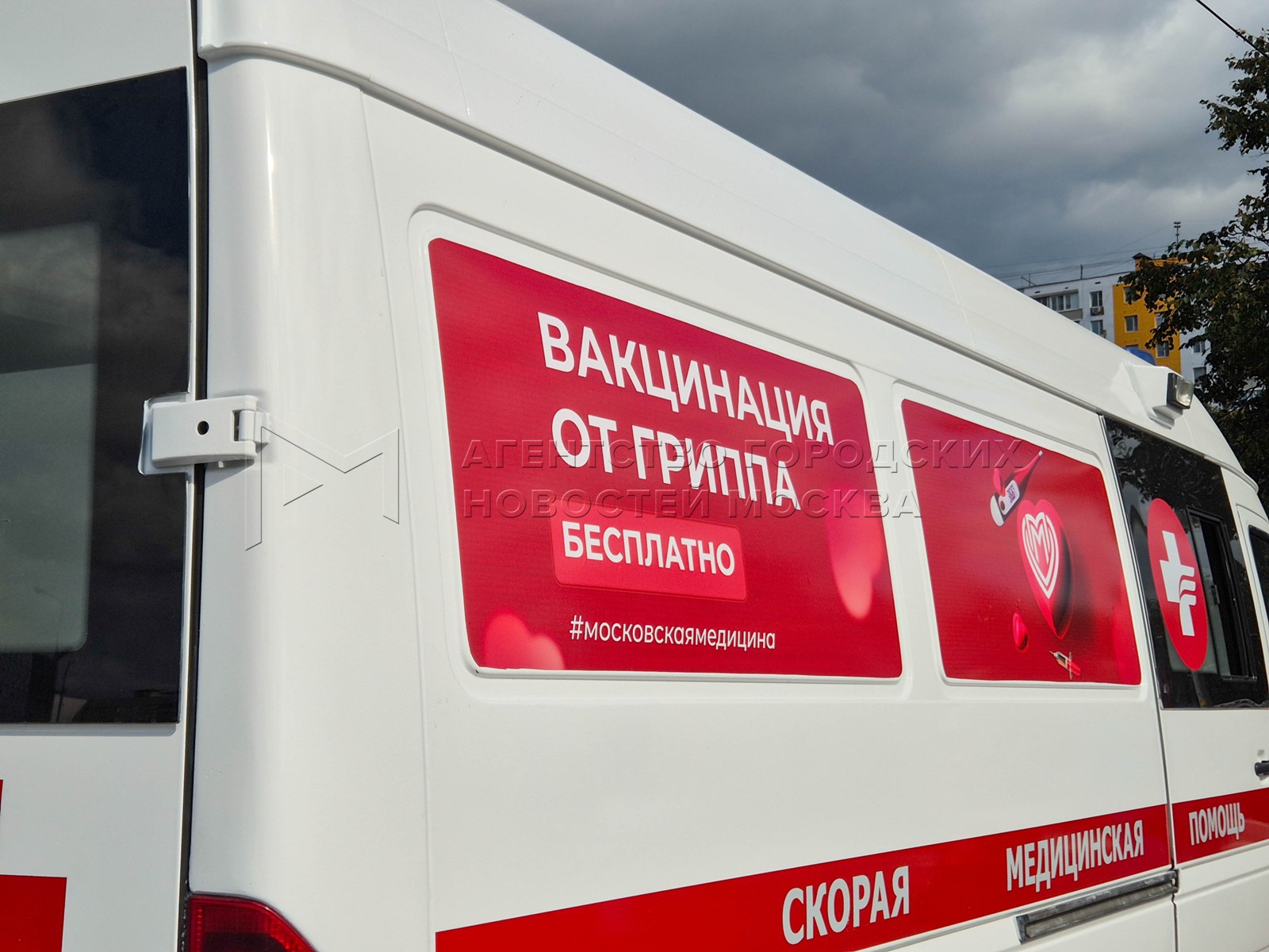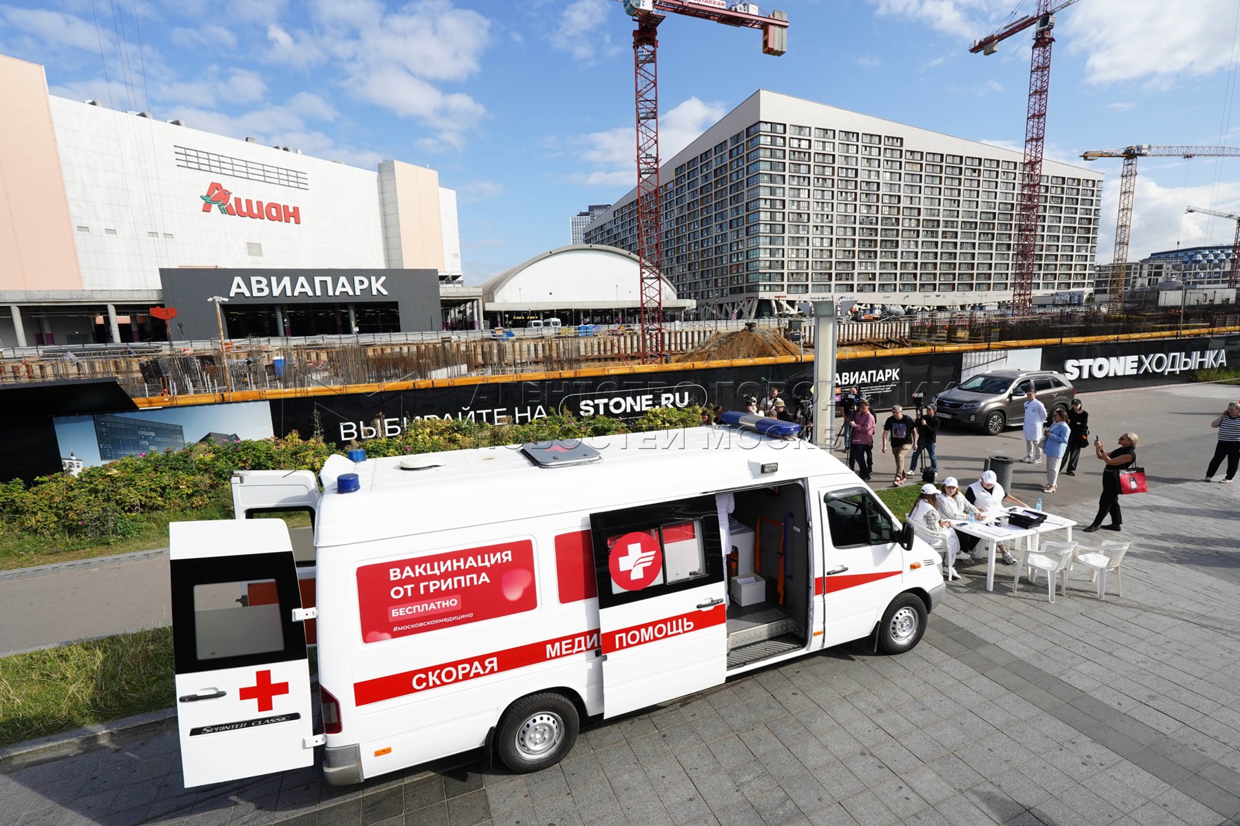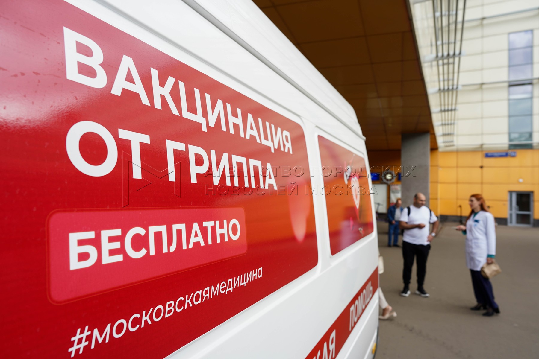 • Описание: Работа мобильного пункта вакцинации от гриппа у станции метро «ЦСКА» в Москве.