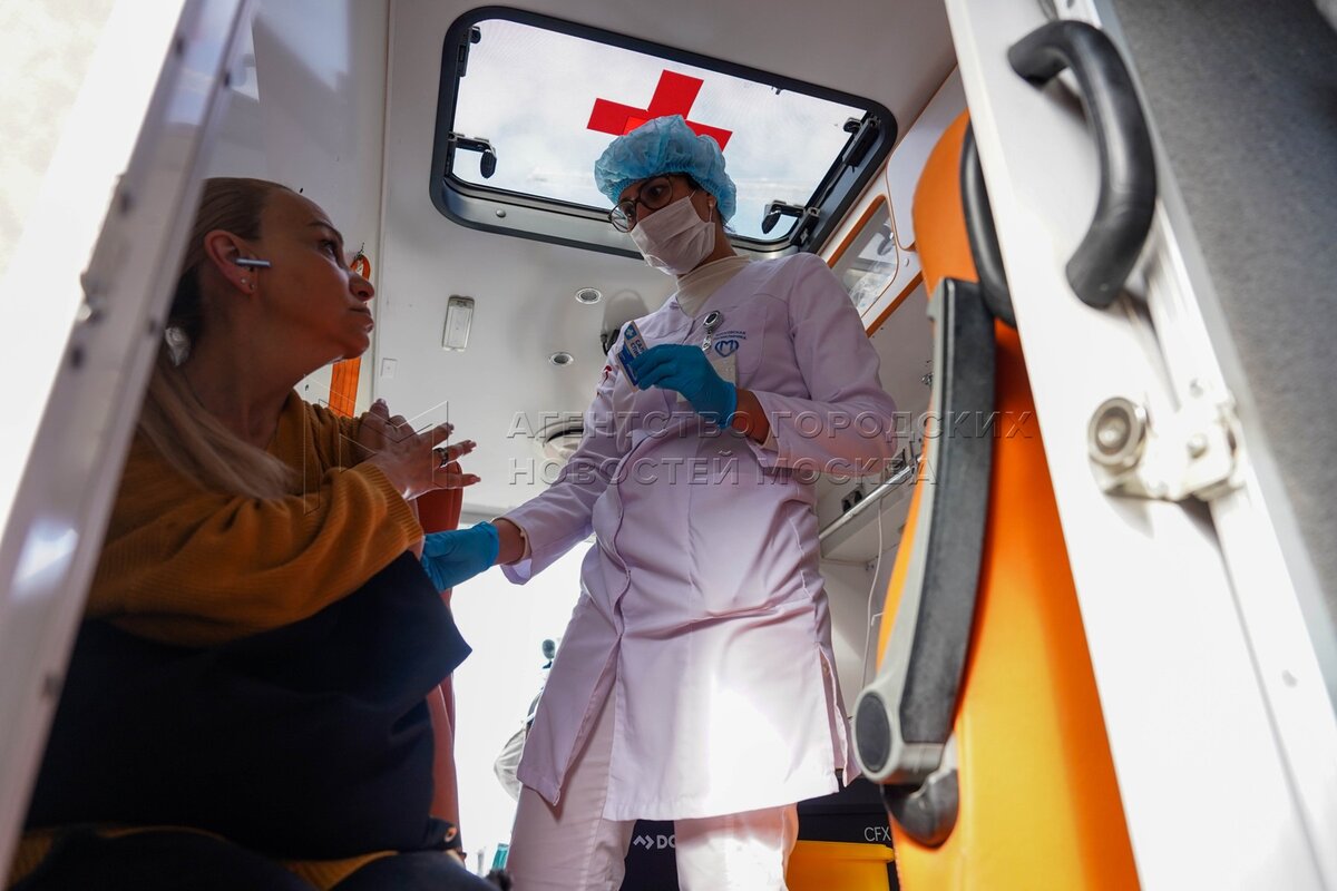 Работа мобильного пункта вакцинации от гриппа у станции метро «Домодедовская» в М...