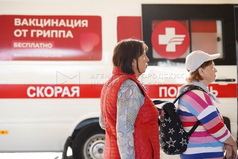 Работа мобильного пункта вакцинации от гриппа у станции метро «ВДНХ».