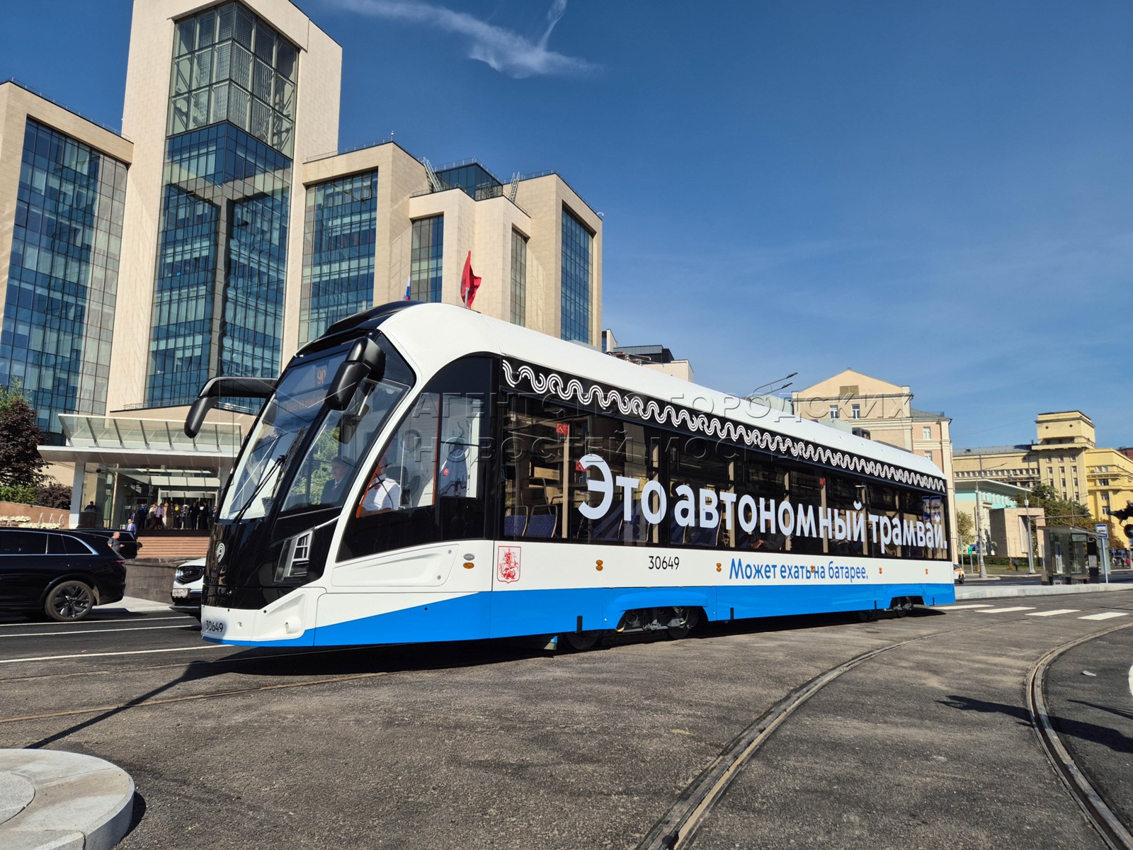 Запуск движения нового маршрута №90 на первой в России трамвайной линии без контактной сети на проспекте Академика Сахарова с трамваями нового поколения с автономным ходом.