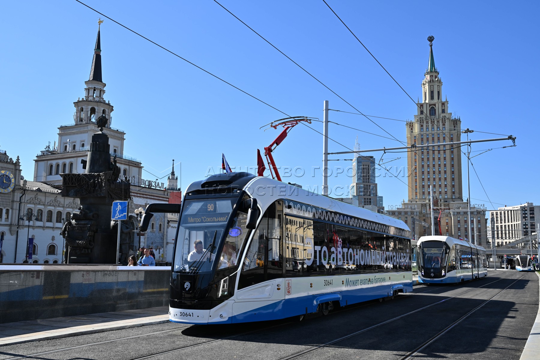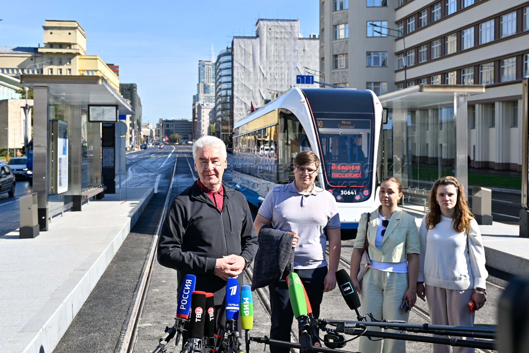 - Описание: Мэр Москвы Сергей Собянин запустил движение нового маршрута №90 на первой в России трамвайной линии без контактной сети на проспекте Академика Сахарова с трамваями нового поколения с автономным ходом. Фото: Владимир Новиков, пресс-служба мэра и правительства Москвы.