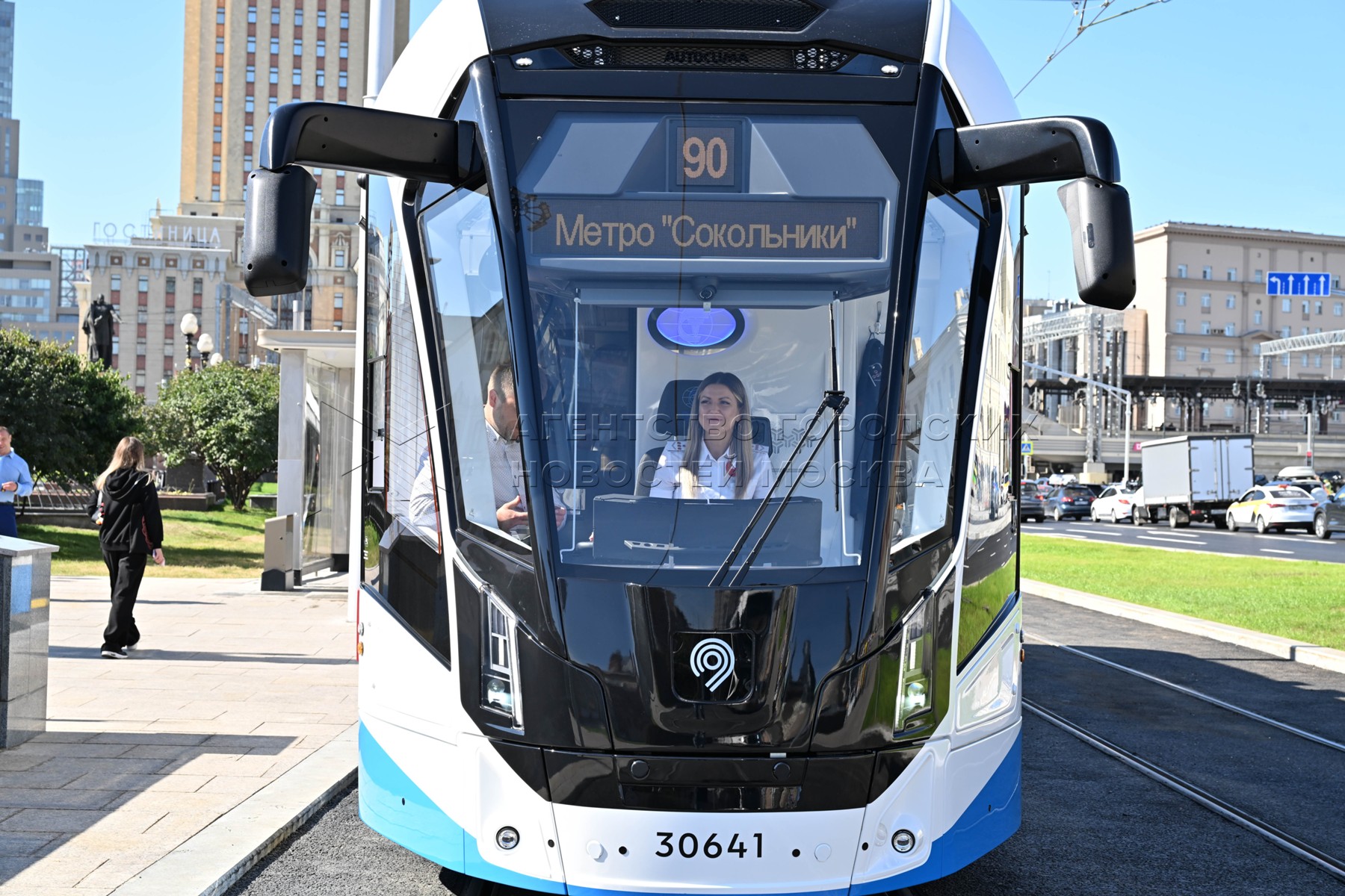 - Описание: Запущено движение нового маршрута №90 на первой в России трамвайной линии без контактной сети на проспекте Академика Сахарова с трамваями нового поколения с автономным ходом. Фото: Владимир Новиков, пресс-служба мэра и правительства Москвы.