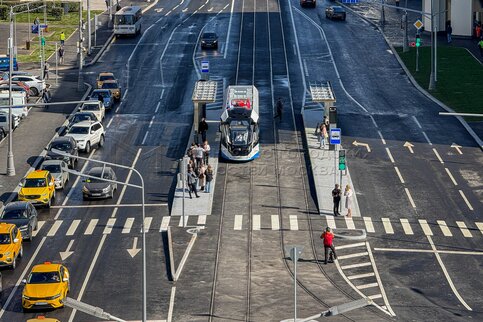 - Описание: Запущено движение нового маршрута №90 на первой в России трамвайной линии без контактной сети на проспекте Академика Сахарова с трамваями нового поколения с автономным ходом.Фото: пресс-служба мэра и правительства Москвы.
