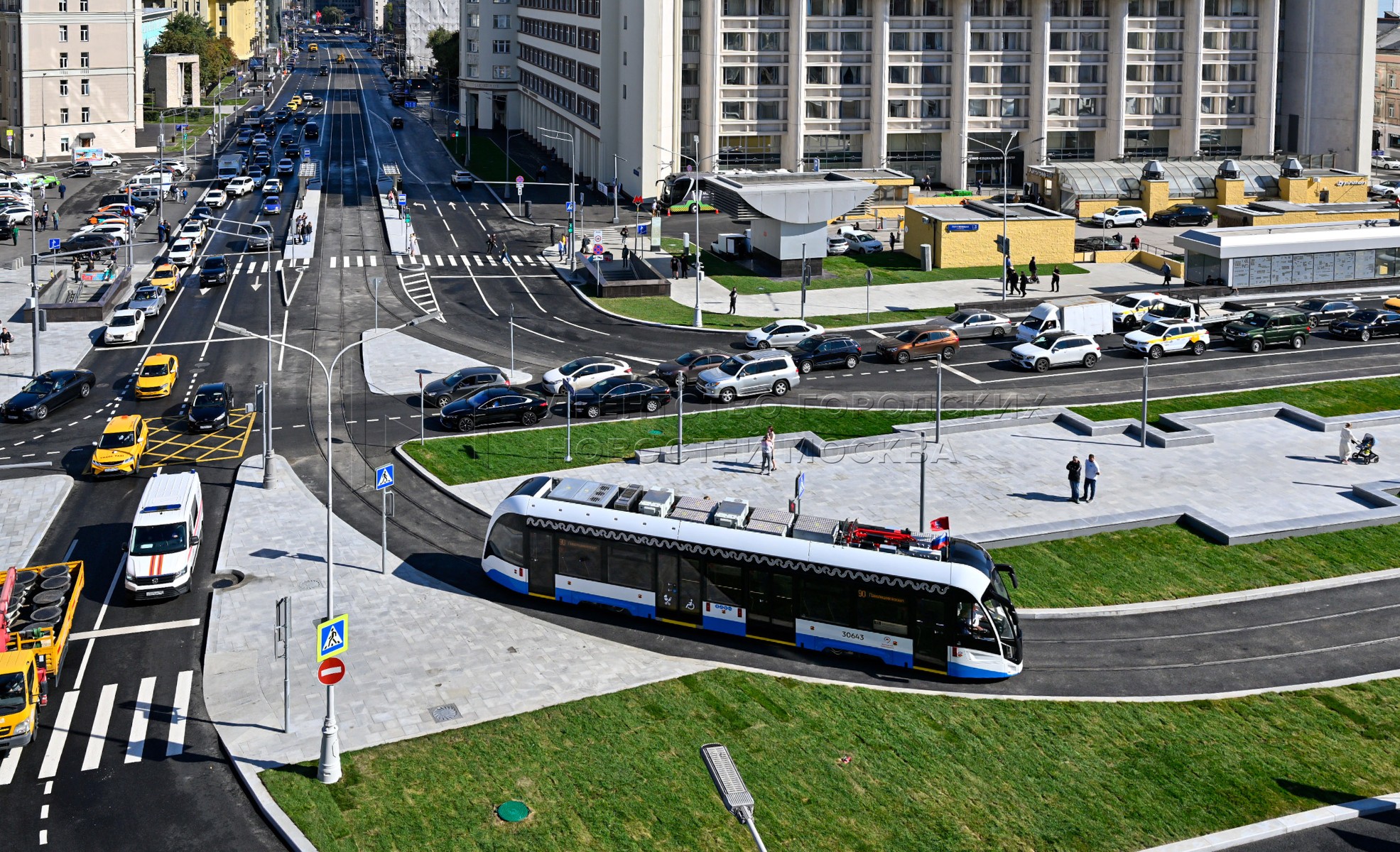 Запущено движение нового маршрута №90 на первой в России трамвайной линии без контактной сети на проспекте Академика Сахарова с трамваями нового поколения с автономным ходом.Фото: пресс-служба мэра и правительства Москвы.