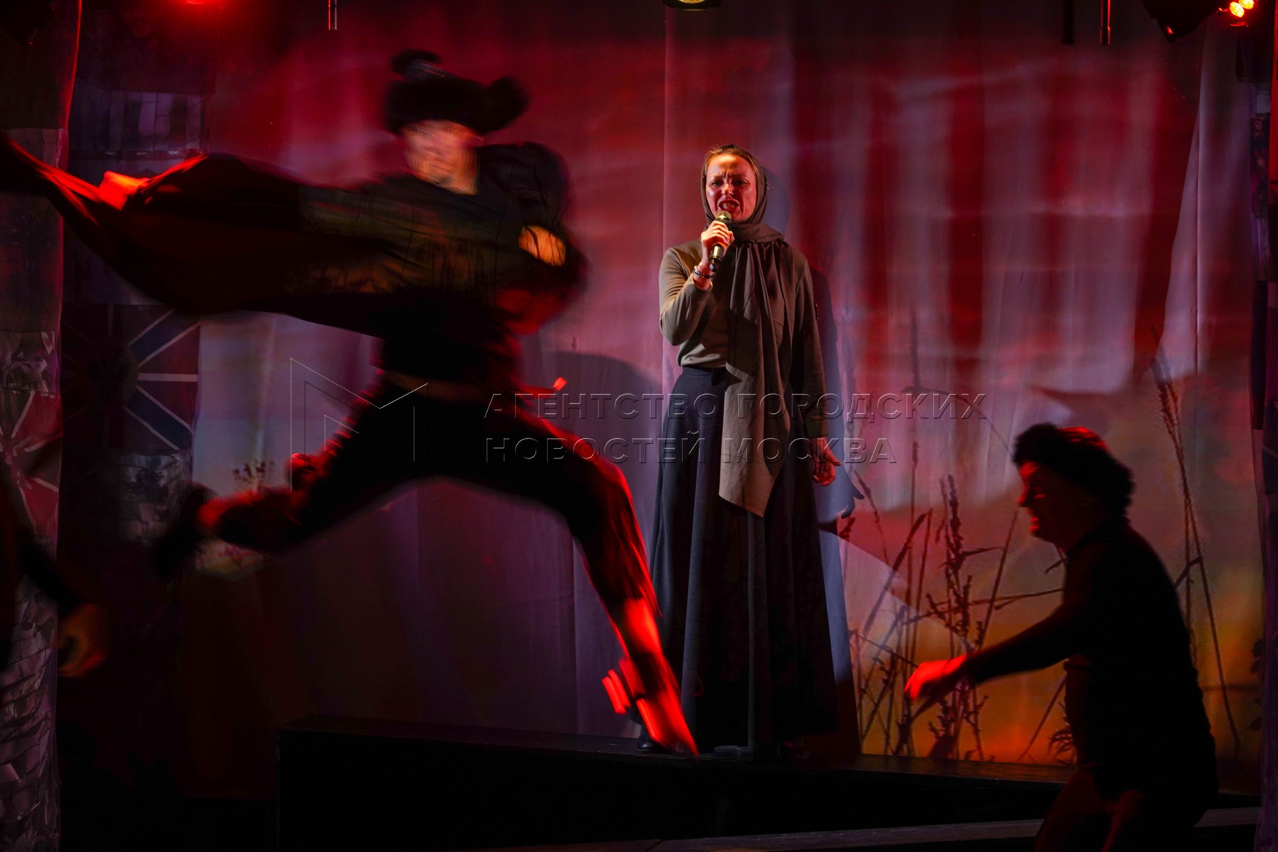 Актеры во время премьерного спектакля «За други СВОя» на открытии 37-го театральн...