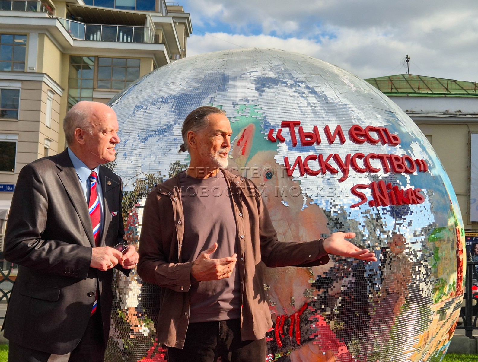 - Описание: Профессор Дипломатической академии Министерства иностранных дел (МИД) РФ Владимир Винокуров (слева), художник Никас Сафронов и арт-объект «Ты и есть искусство» с языками стран БРИКС и ШОС – подарок Н. Сафронова ко Дню города в рамках проекта «Лето в Москве» на Страстном бульваре.