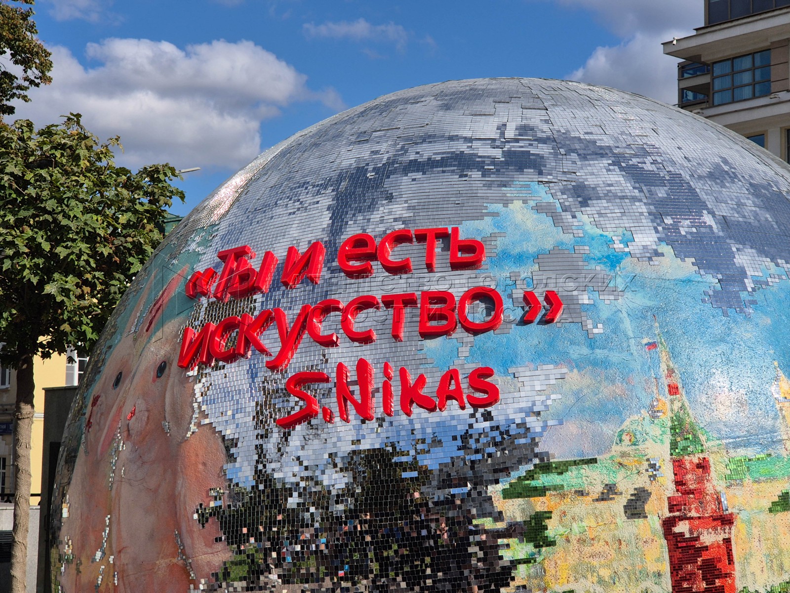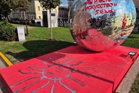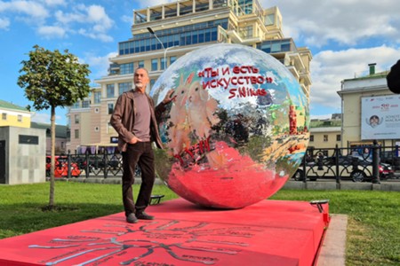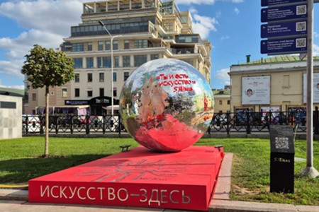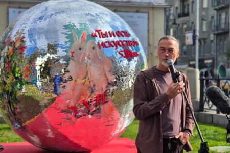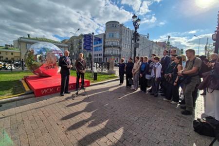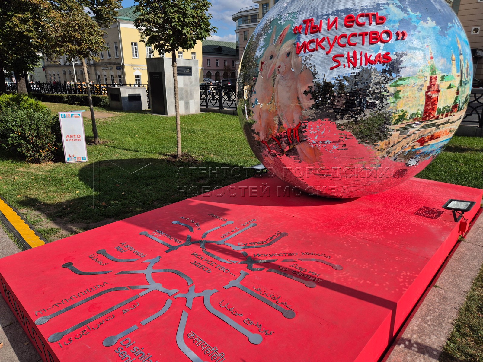 - Описание: Художник Никас Сафронов и арт-объект «Ты и есть искусство» с языками стран БРИКС и ШОС – подарок Н. Сафронова ко Дню города в рамках проекта «Лето в Москве» на Страстном бульваре.