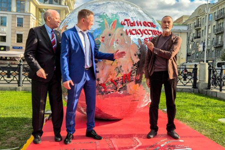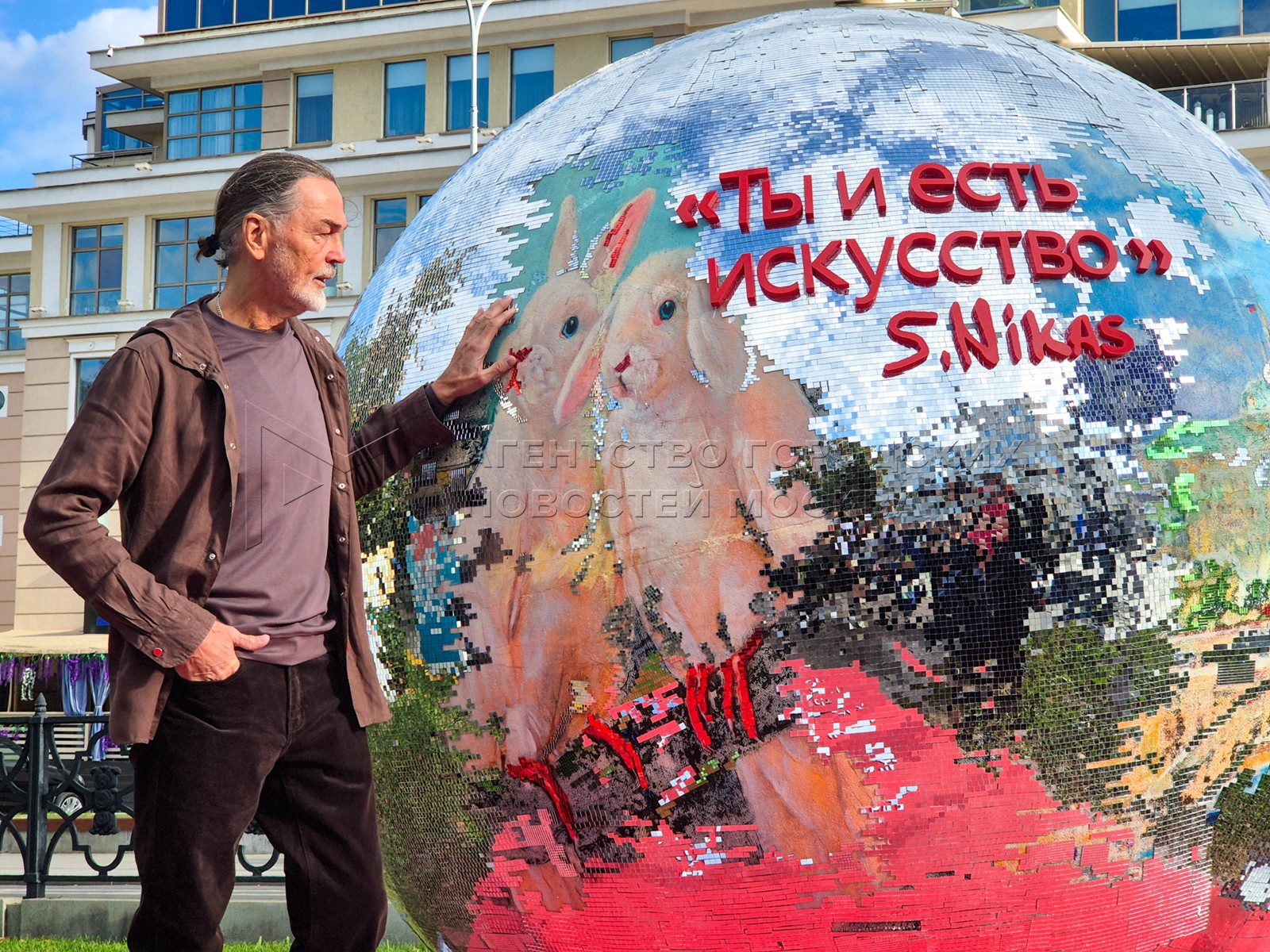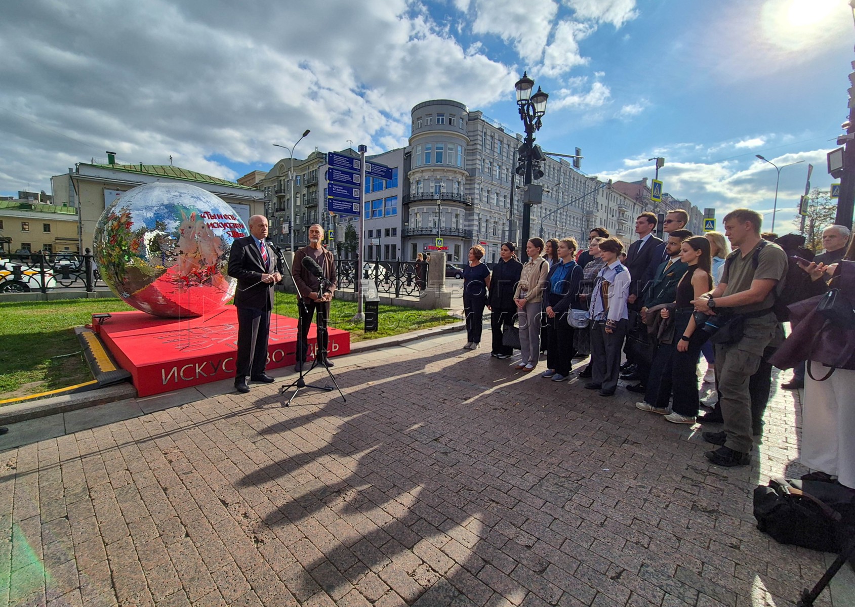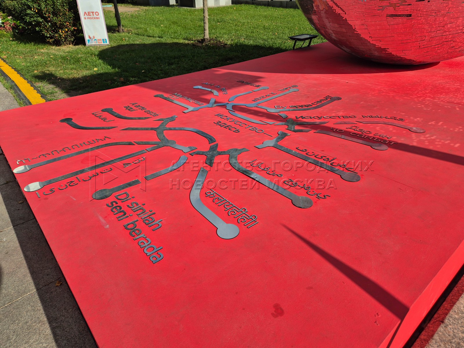 - Описание: Художник Никас Сафронов и арт-объект «Ты и есть искусство» с языками стран БРИКС и ШОС – подарок Н. Сафронова ко Дню города в рамках проекта «Лето в Москве» на Страстном бульваре.