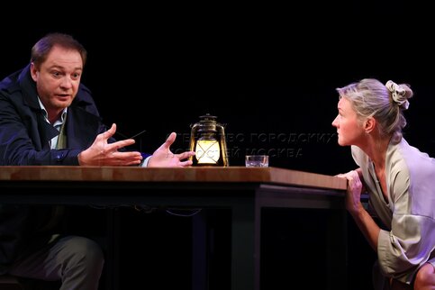 Актеры Наталия Житкова в роли Марианны и Григорий Старостин в роли Юхана. Показ спектакля по киносценарию Ингмара Бергмана «Сцены из супружеской жизни» в театре Et Cetera.