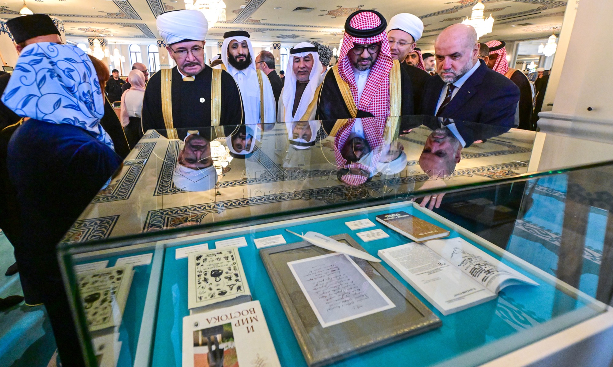 Председатель Совета муфтиев России и Духовного управления мусульман России, муфтий Равиль Гайнутдин (слева по центру). Открытие выставки «С небесной книги список дан…» к 200-летию поэтического цикла «Подражания Корану» Александра Пушкина в Музее ислама на территории Московской Соборной мечети.