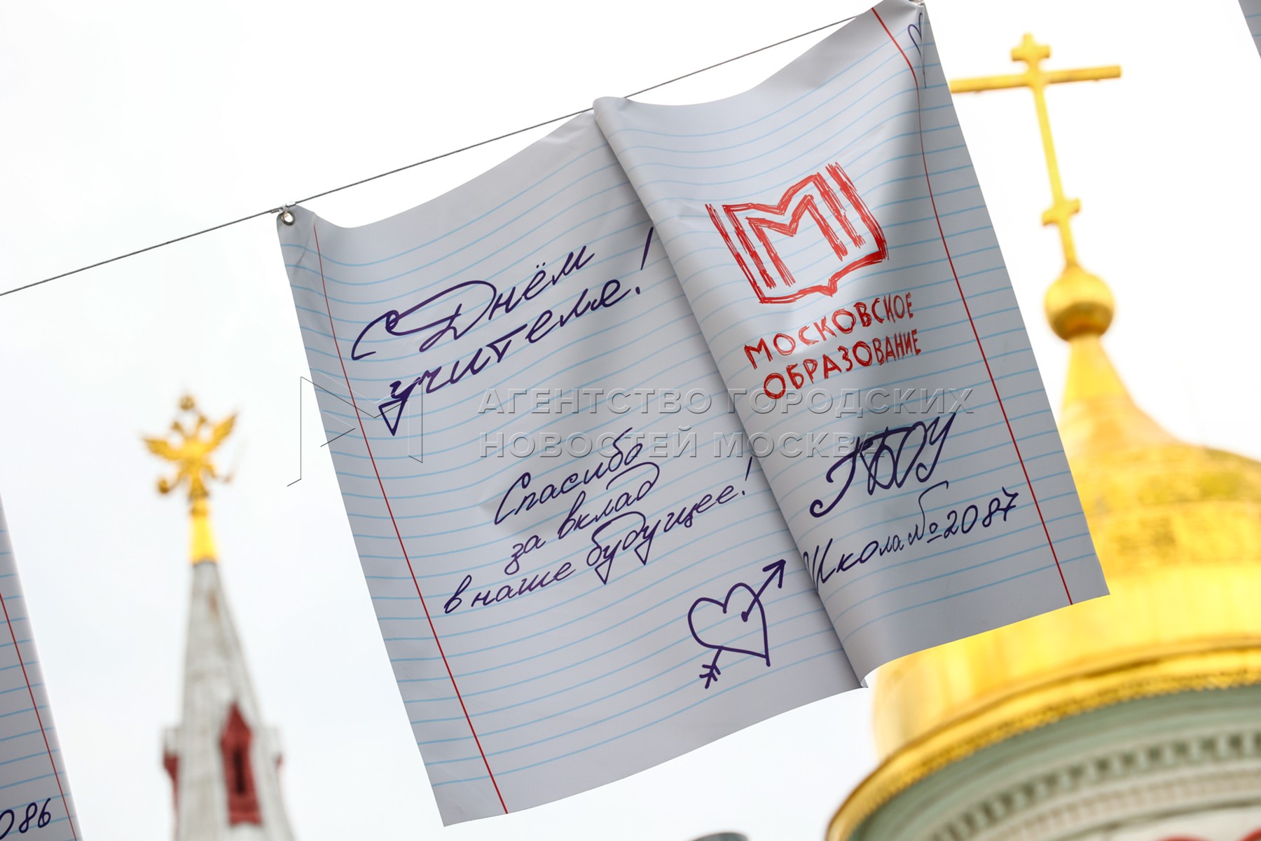 Инсталляция в виде тетрадных листов с пожеланиями педагогам столичных школ, разме...