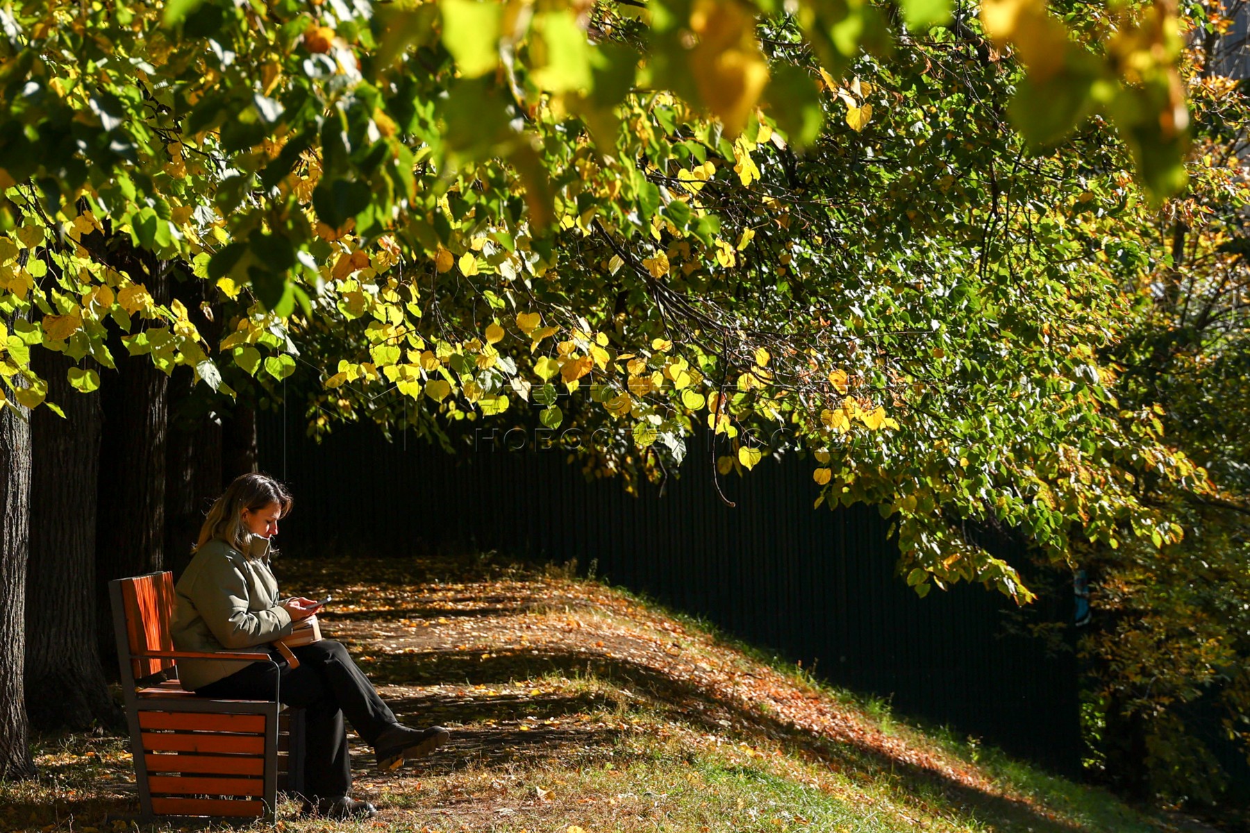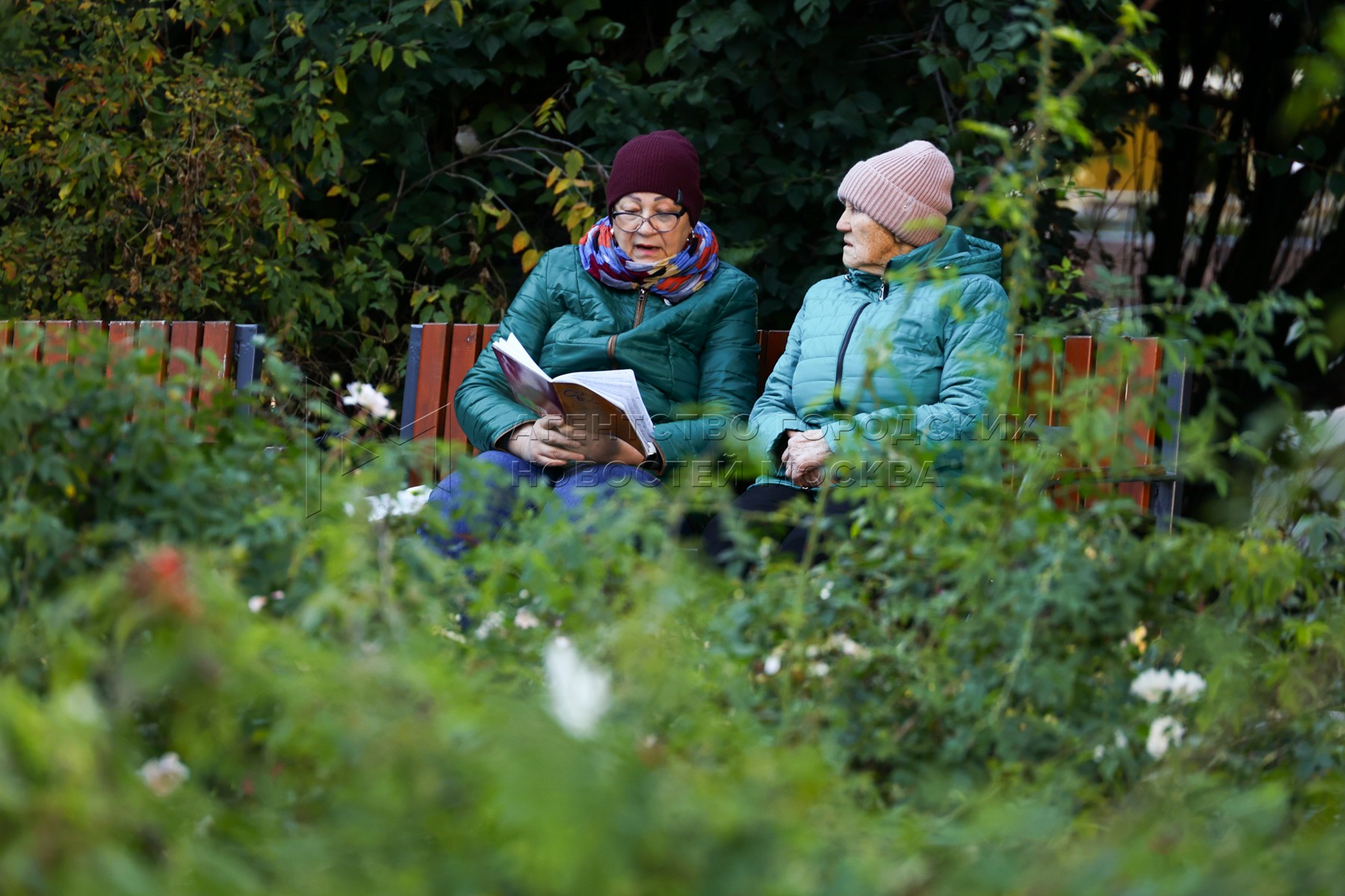 Осенние городские жанры. Пожилые женщины на скамейке в парке.
