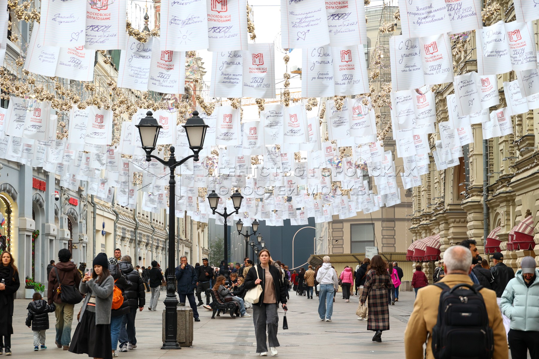 Инсталляция в виде тетрадных листов с пожеланиями педагогам столичных школ, размещенная на ул. Никольская.
