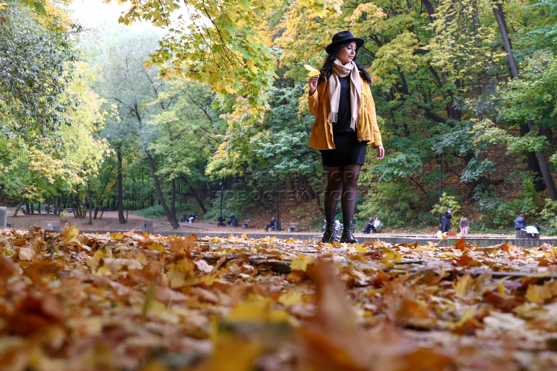 Осенние городские жанры. Девушка среди опавшей листвы.