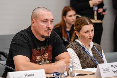 Рэп-исполнитель Рома Жиган (Роман Чумаков) во время дискуссии «Патриотика. 809». ...