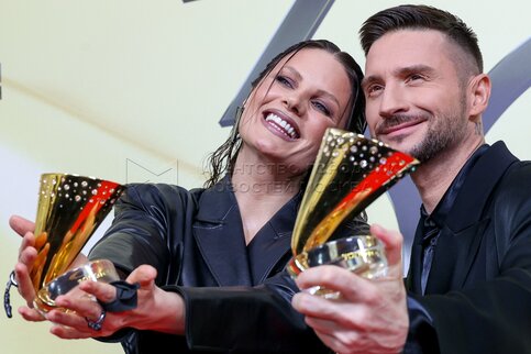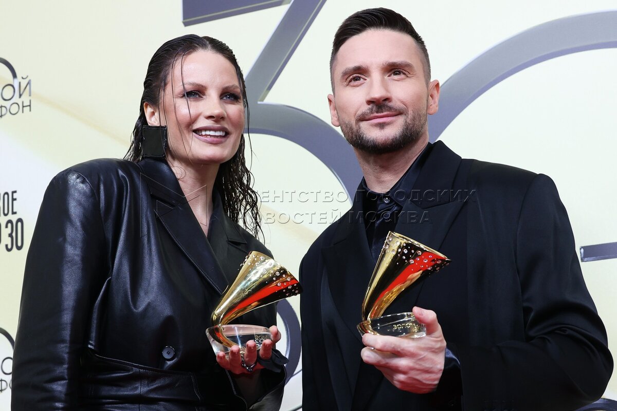 Певцы Ева Власова и Сергей Лазарев на красной дорожке юбилейной 30-й церемонии вр...