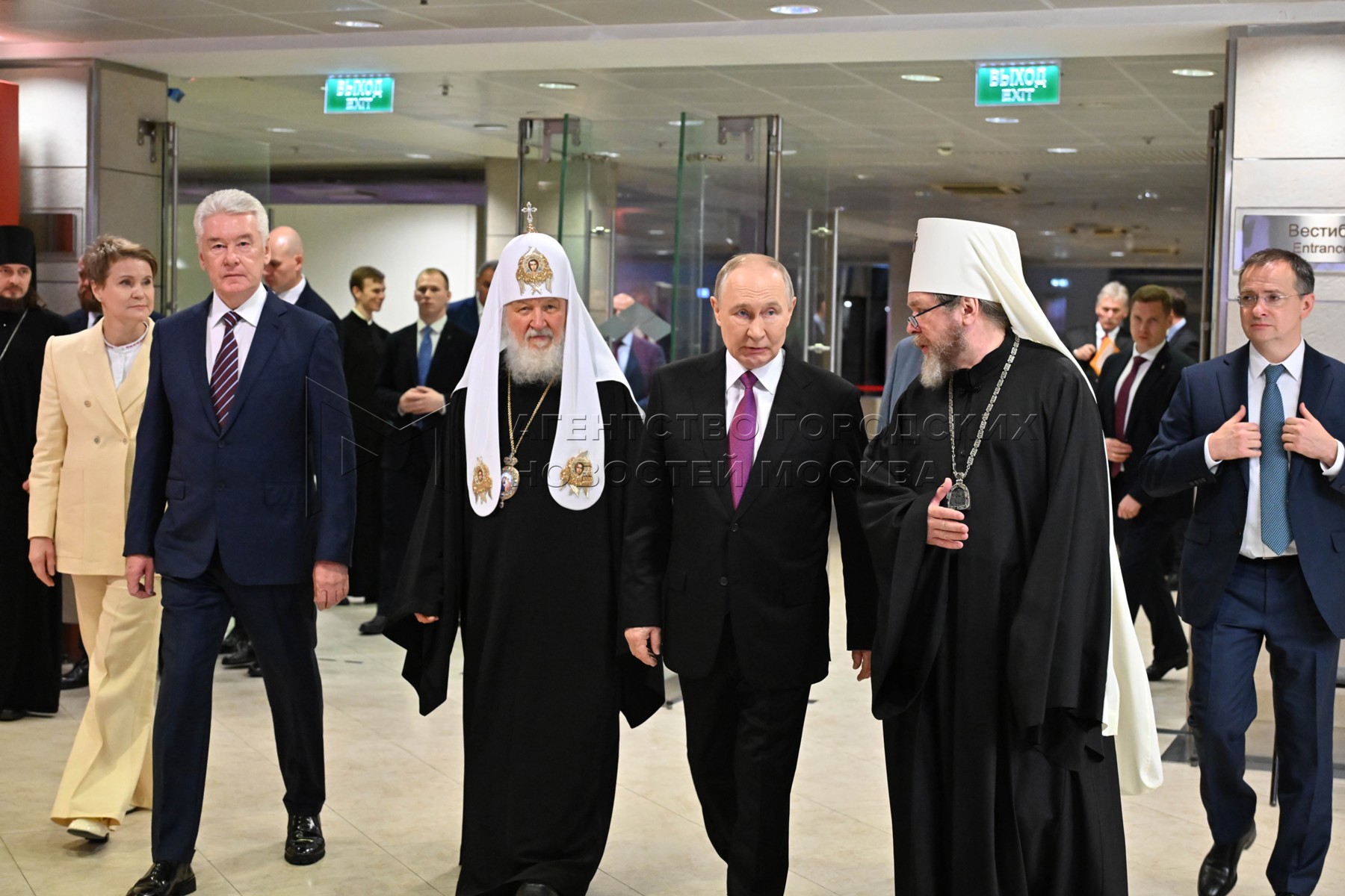 - Описание: Президент России Владимир Путин (в центре) и мэр Москвы Сергей Собянин (слева) посетили историко-документальную выставку «Великая Победа. Россия – моя история» в центральном выставочном зале «Манеж». Фото: Владимир Новиков, пресс-служба мэра и правительства Москвы. Справа – помощник президента РФ, председатель РВИО Владимир Мединский. Второй слева – патриарх Московский и всея Руси Кирилл.