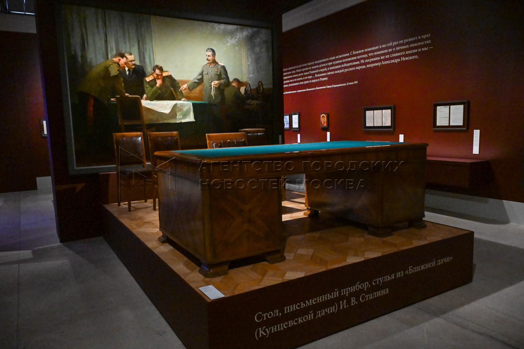 - Описание: Стол, письменный прибор, стулья из «Ближней дачи» (Кунцевской дачи) И.В. Сталина. Историко-документальная выставка «Великая Победа. Россия – моя история» в центральном выставочном зале «Манеж». Фото: Владимир Новиков, пресс-служба мэра и правительства Москвы.