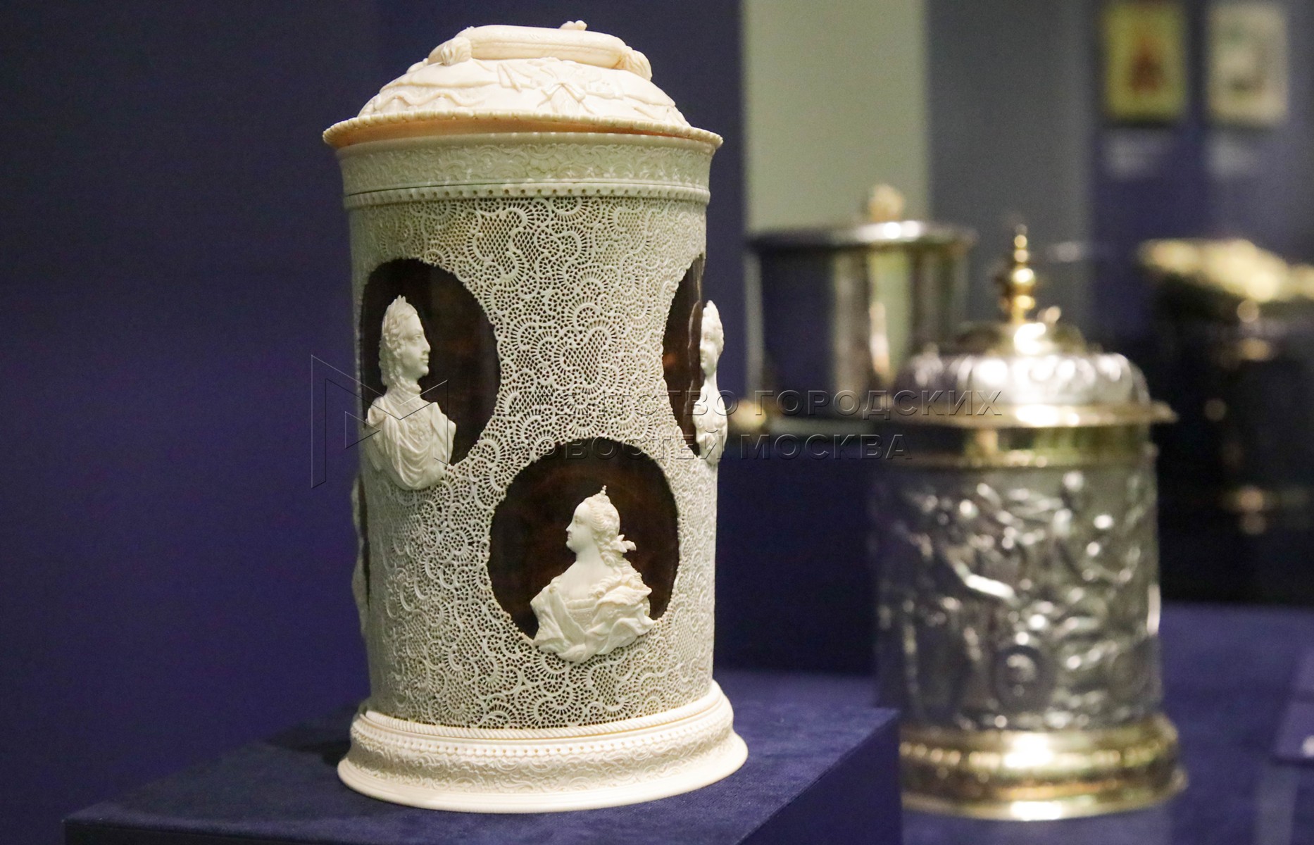 - Описание: Кружка. Вклад в Соловецкий монастырь Осипа Дудина (мастер – Осип Дудин, Санкт-Петербург, 1774 г., слоновая кость, панцирь черепахи, резьба). Выставка «Святая обитель: к 600-летию Соловецкого монастыря» в музейной галерее храма Христа Спасителя.