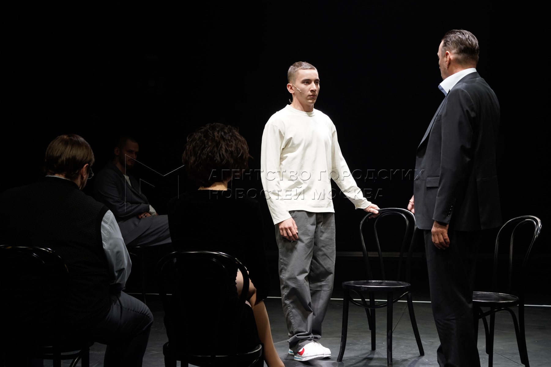• Описание: Актеры Федор Бычков в роли Петра (в центре) и Дмитрий Цурский в роли Ивана Коломийцева (справа). Показ спектакля «Последние» перед премьерой в Московском еврейском театре «Шалом».
