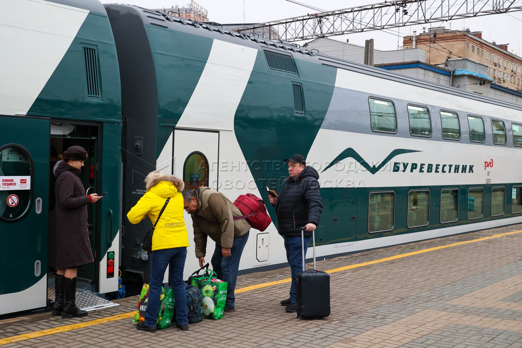 Пассажиры первого рейса обновленного двухэтажного поезда «Буревестник», следующег...