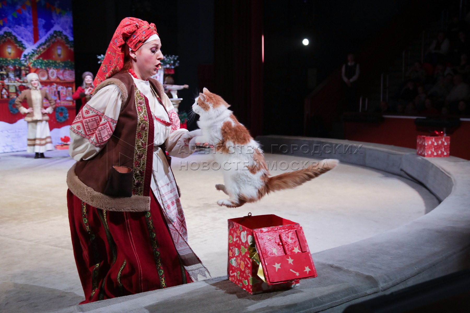 Дрессированный кот во время предпоказа спектакля «Полет в страну мечты» в ГБУК Мо...