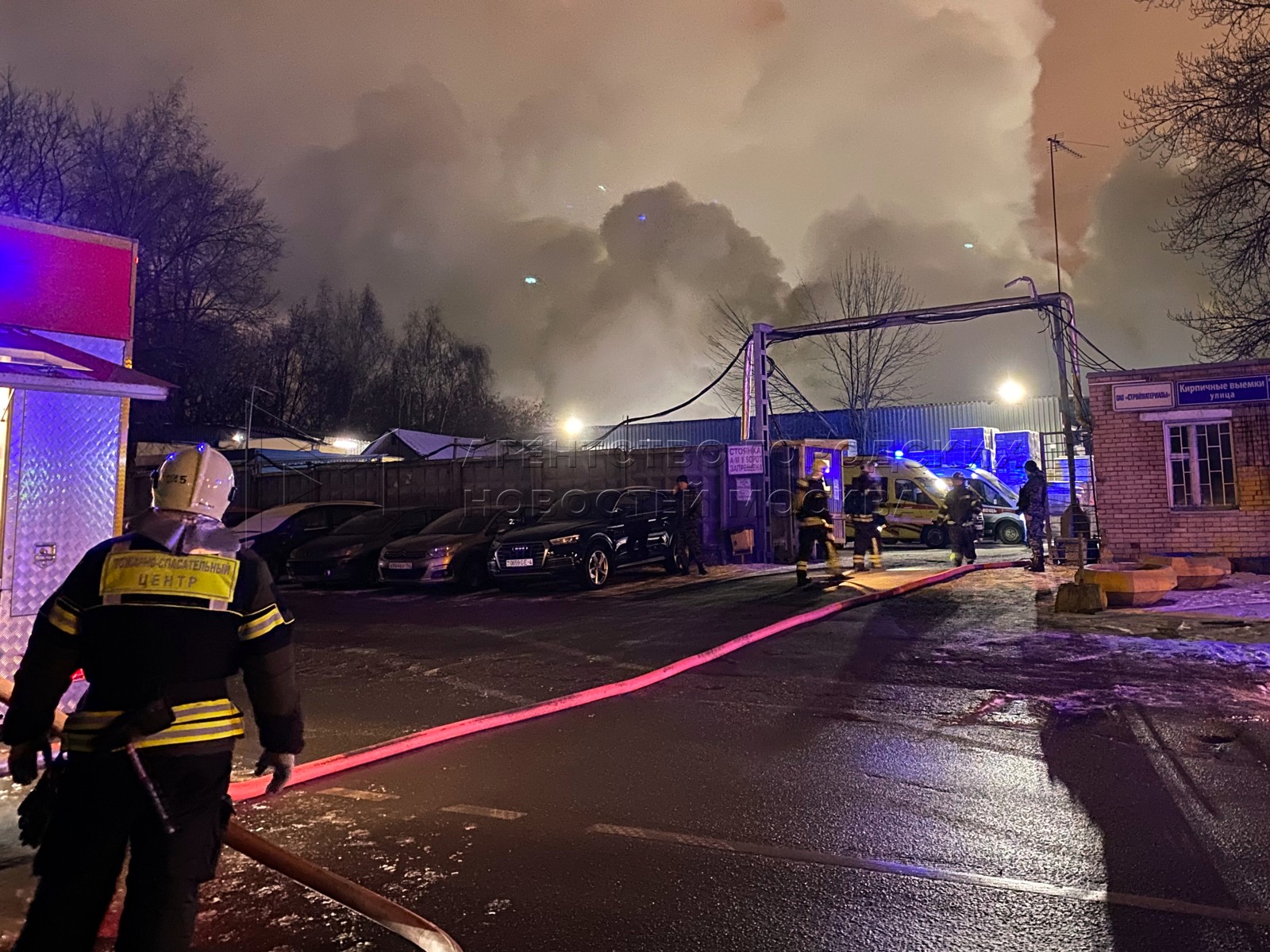 Работа пожарно-спасательных подразделений на месте возгорания в ангаре на ул. Кирпичные Выемки на юге Москвы.