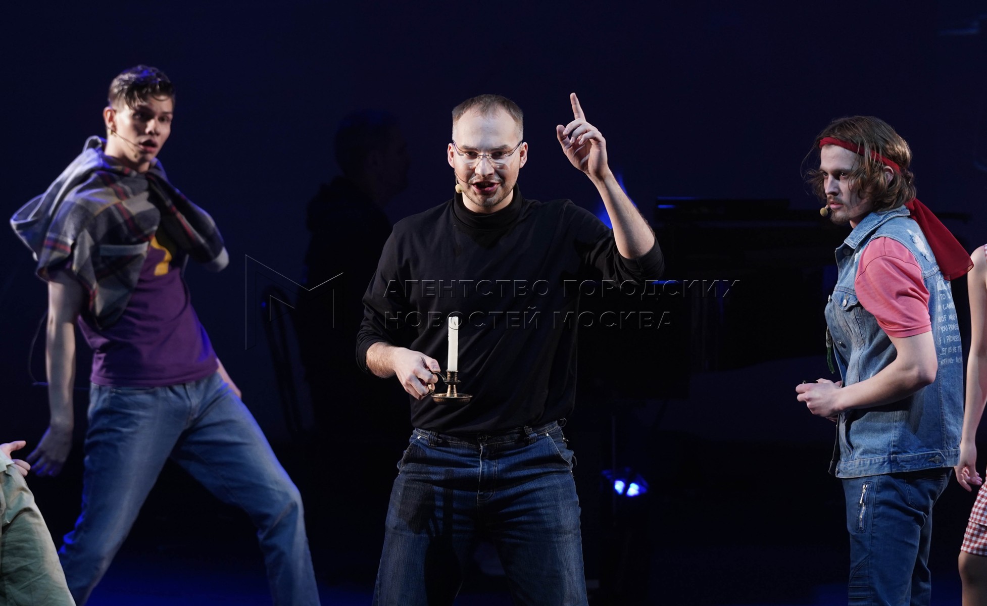 - Описание: Богдан Ханин в роли Стива Джобса (в центре) на премьерном показе музыкального спектакля Марка Розовского «Джобс» о жизни одного из основателей компании Apple Стива Джобса в Московском государственном театре «У Никитских ворот».