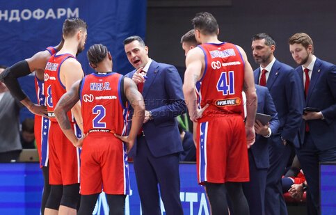 Игрок ЦСКА Иван Ухов и главный тренер БК ЦСКА Андреас Пистиолис (слева направо) в...