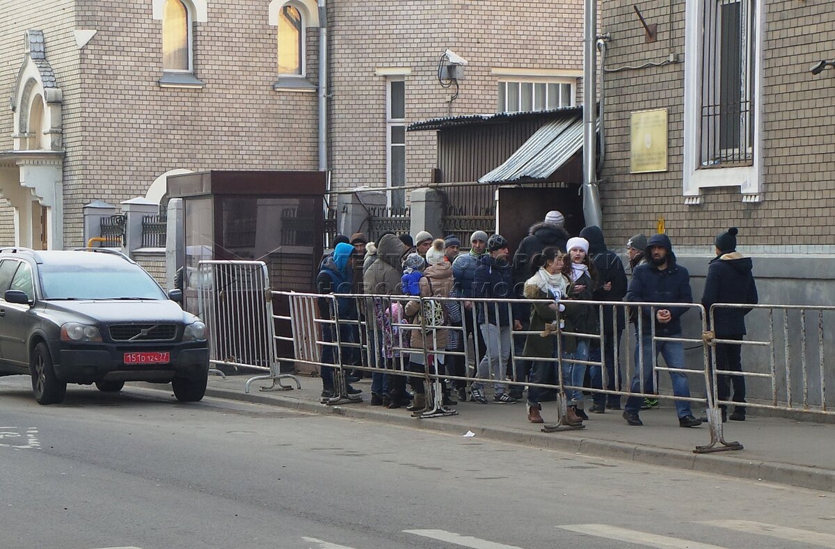 • Описание: Граждане Таджикистана у консульской службы посольства республики в Москве