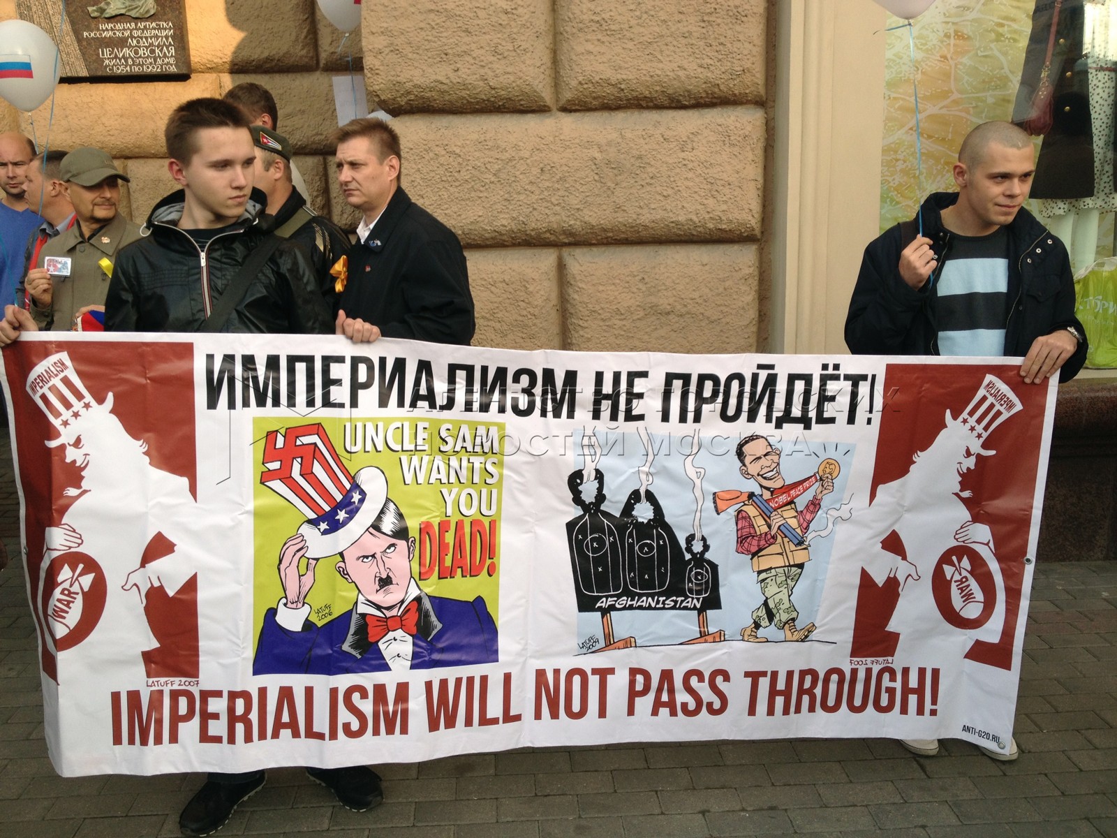• Описание: Митинг КПРФ «Против американо-натовской агрессии в отношении суверенного государства Сирии» на Новинском бульваре напротив здания посольства США.