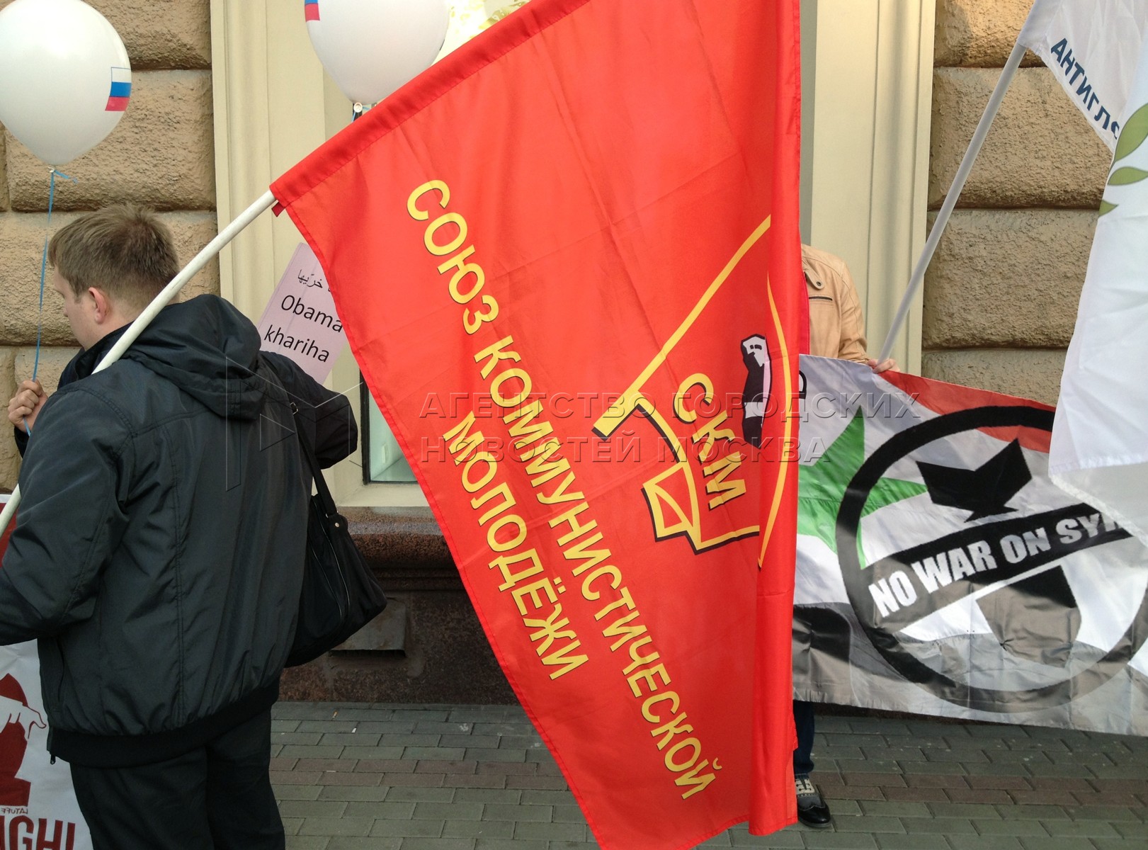 • Описание: Митинг КПРФ «Против американо-натовской агрессии в отношении суверенного государства Сирии» на Новинском бульваре напротив здания посольства США.