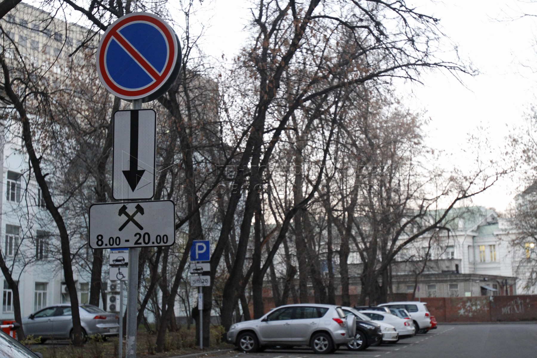 Знак «Стоянка запрещена» с табличкой, предписывающей время действия знака по рабочим дням с 08:00 до 20:00 в Самарском переулке