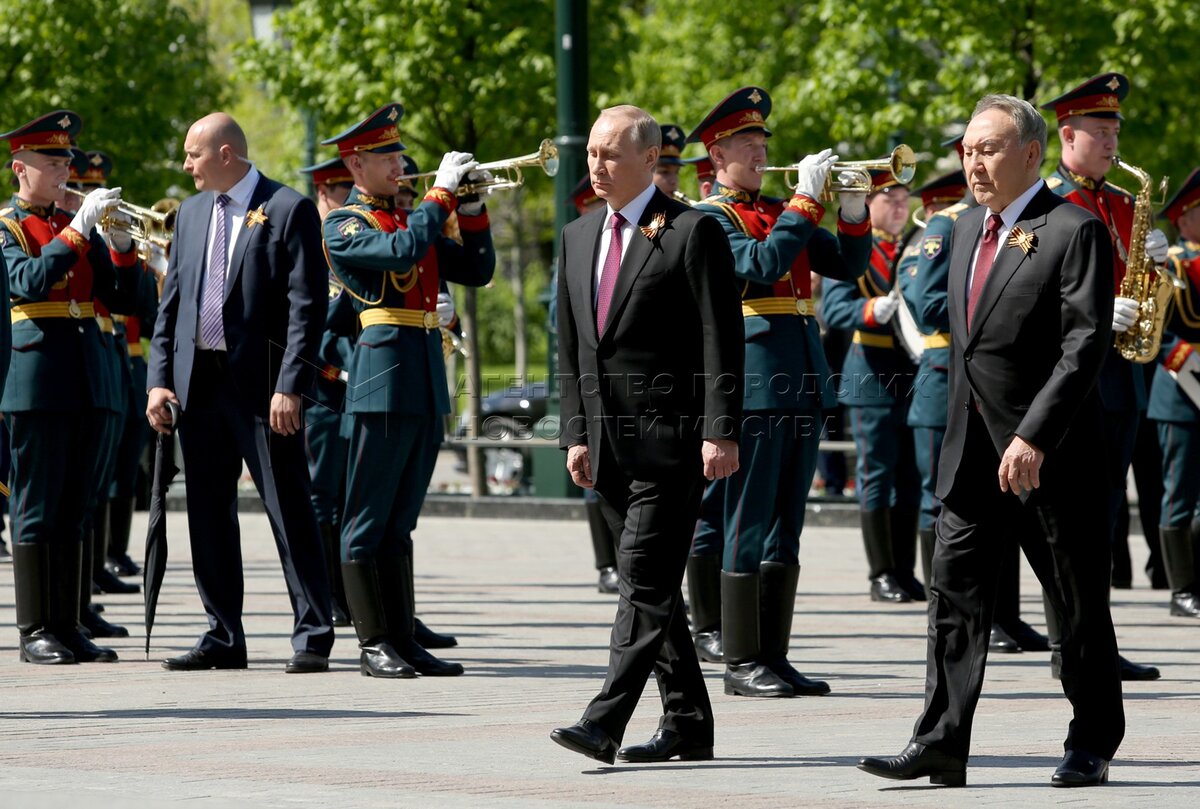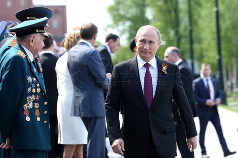Президент России Владимир Путин (в центре) после церемонии возложения цветов к Мо...