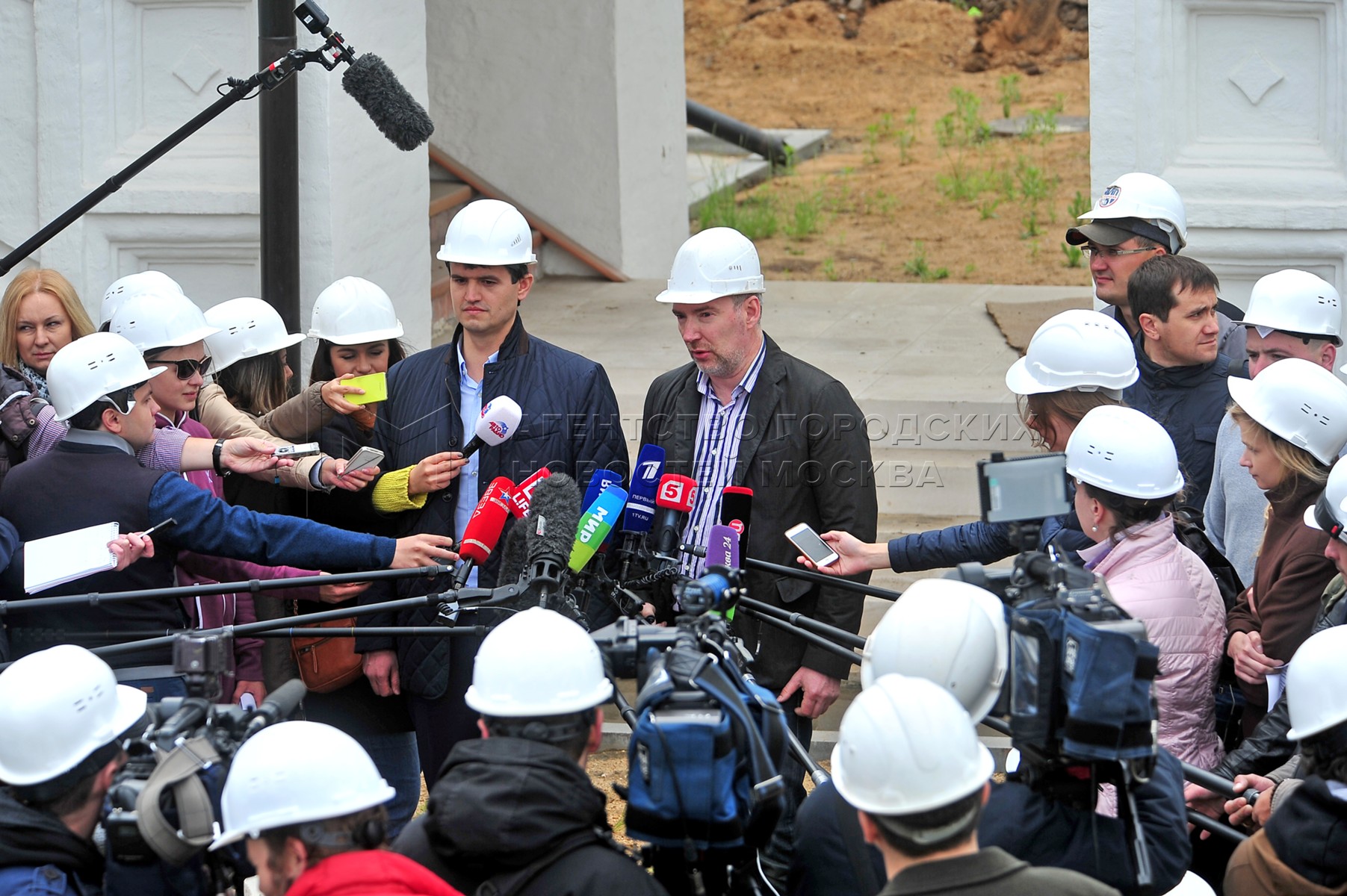• Описание: Генеральный директор ООО «Столичное археологическое бюро» Константин Воронин (в центре) во время интервью на территории строящегося парка «Зарядье»