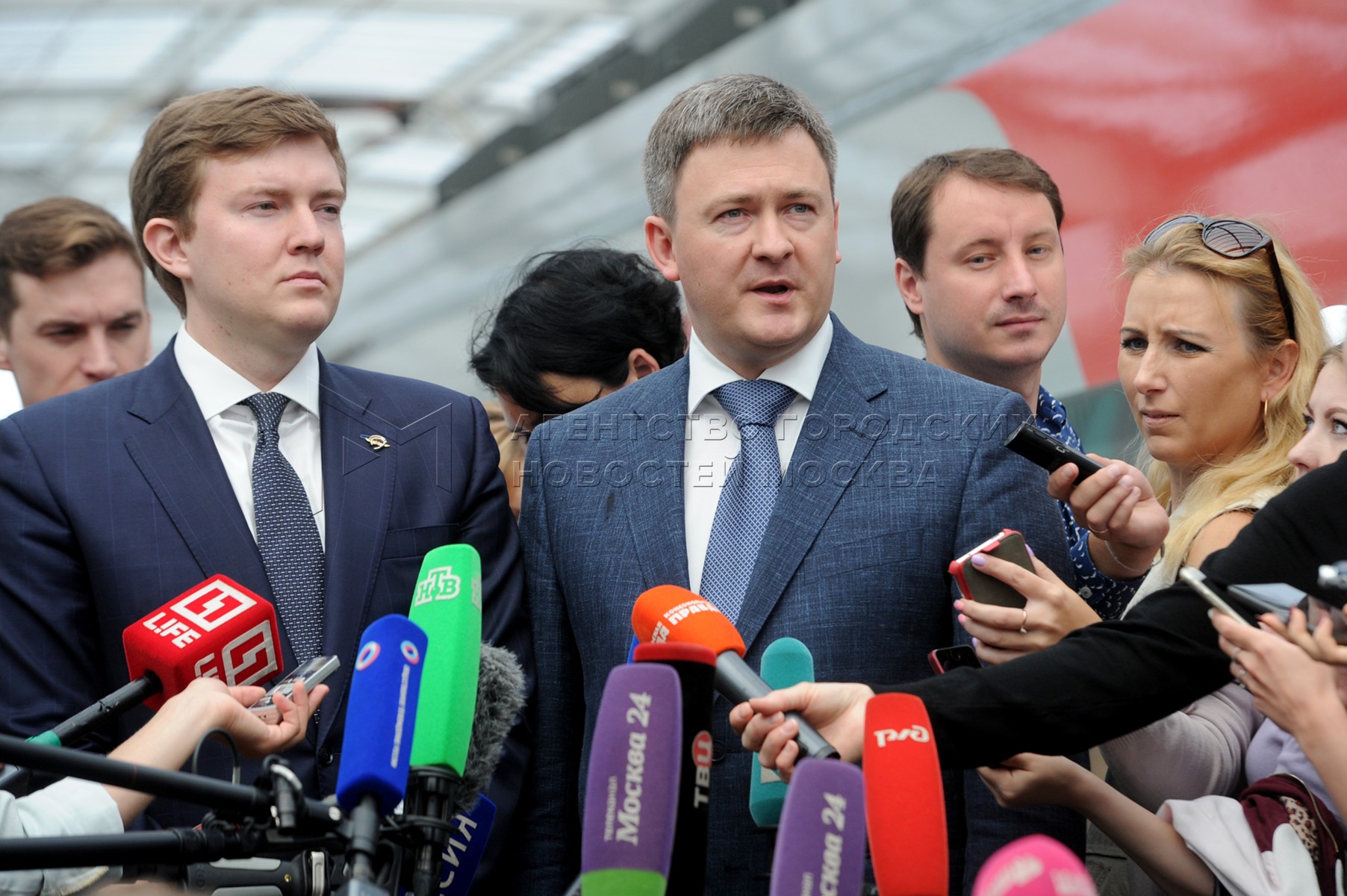 Начальник департамента управления бизнес-блоком «Пассажирские перевозки» ОАО «РЖД» Максим Шнейдер (в центре) во время тестового объезда электропоездов «Ласточка» станций Московского центрального кольца (МКЖД)
