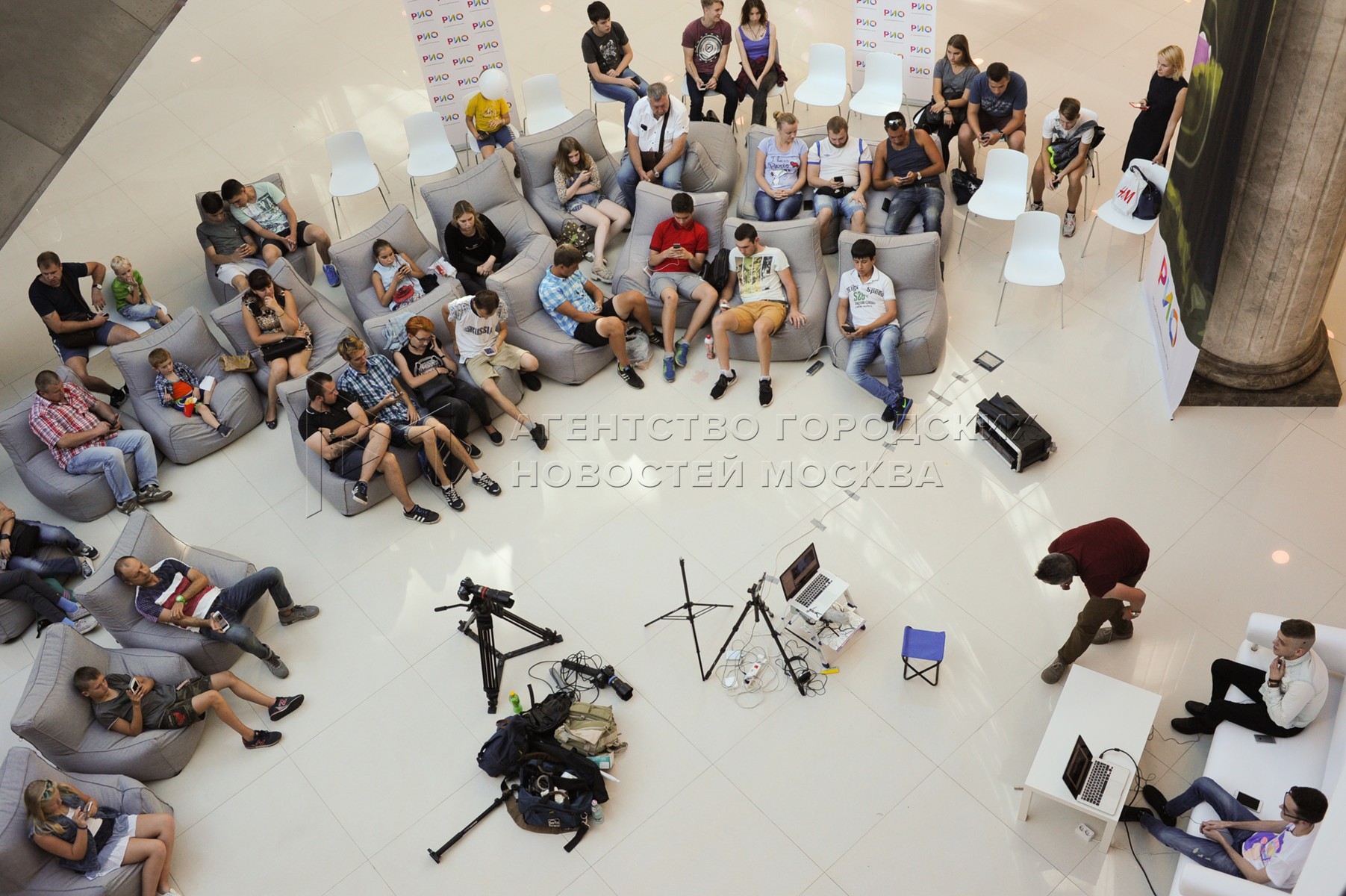 Мастер-класс чемпиона мира по игре «Покемон Гоу» в ТРЦ «РИО» в Москве. Участники мастер-класса с мобильными телефонами.