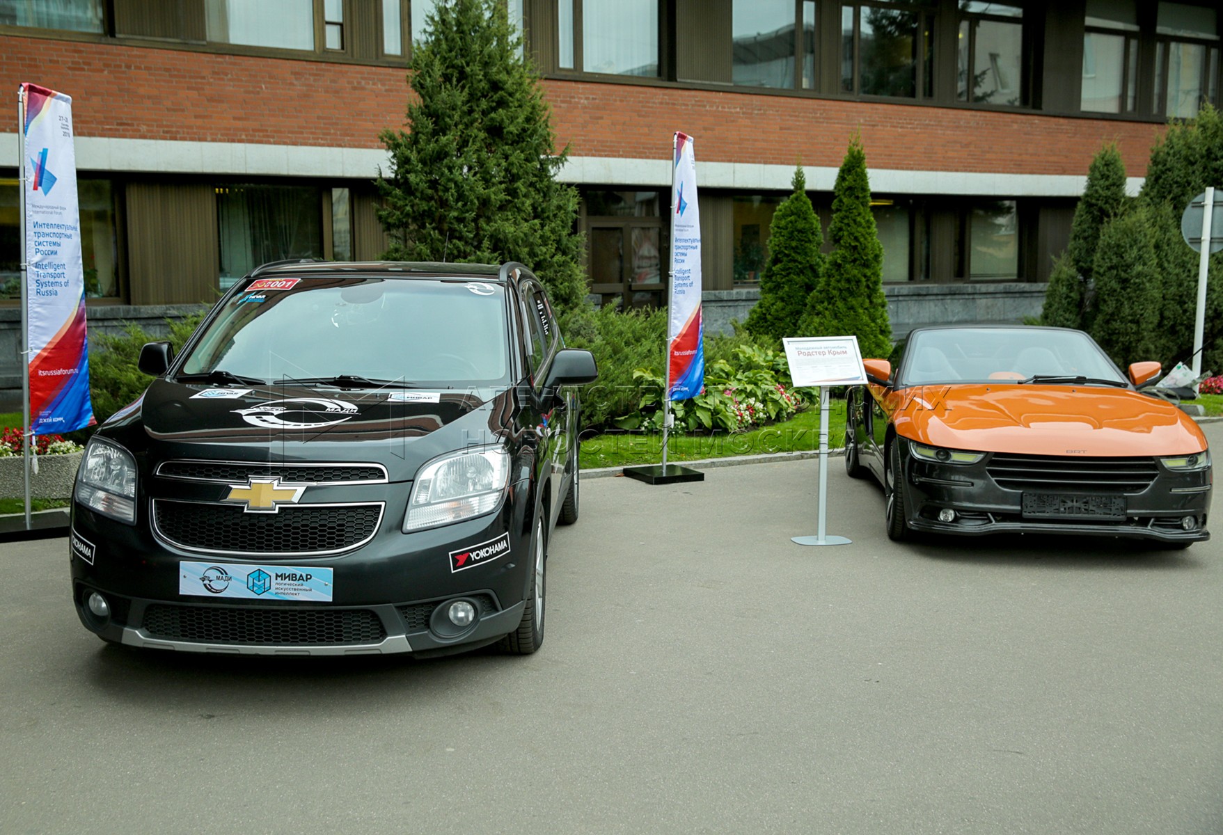 - Описание: Беспилотный автомобиль от компании «Мивар» (слева) и Московского автомобильно-дорожного государственного технического университета (МАДИ) в систему управления которого интегрирован модуль принятия решений, созданный на базе миварных технологий и центральномоторный родстер «Крым», разработанный и собранный выпускниками МГТУ им. Баумана из команды Bauman Racing Team