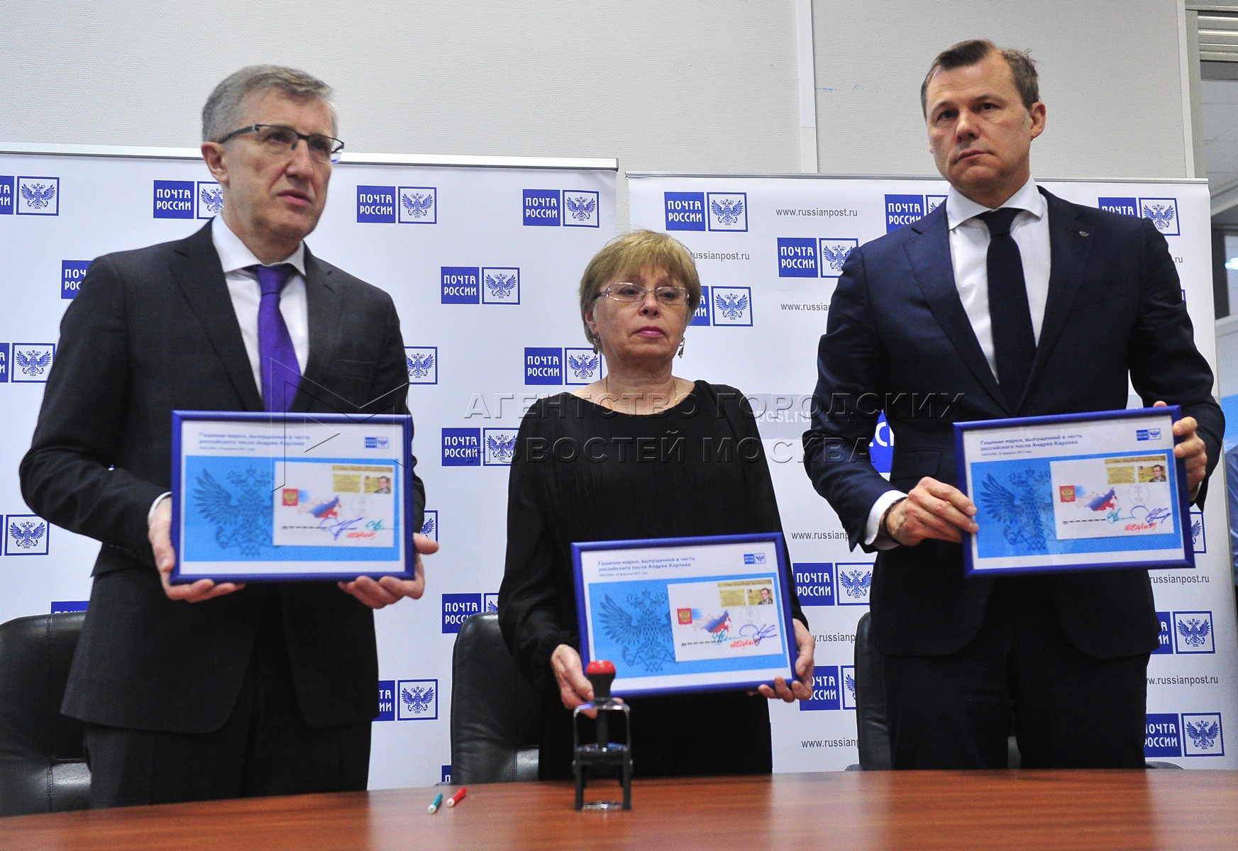- Описание: Генеральный директор МИД России Сергей Вязалов (слева), вдова дипломата Андрея Карлова Марина Карлова (в центре), генеральный директор ФГУП «Почта России» Дмитрий Страшнов (справа) на церемонии гашения марки, выпущенной в честь российского дипломата А.Карлова.
