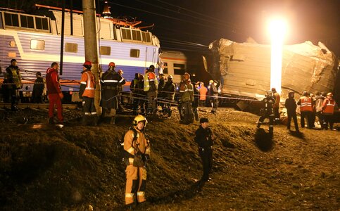 • Описание: Работа экстренных служб на месте столкновения пассажирского поезда и электрички на западе Москвы.