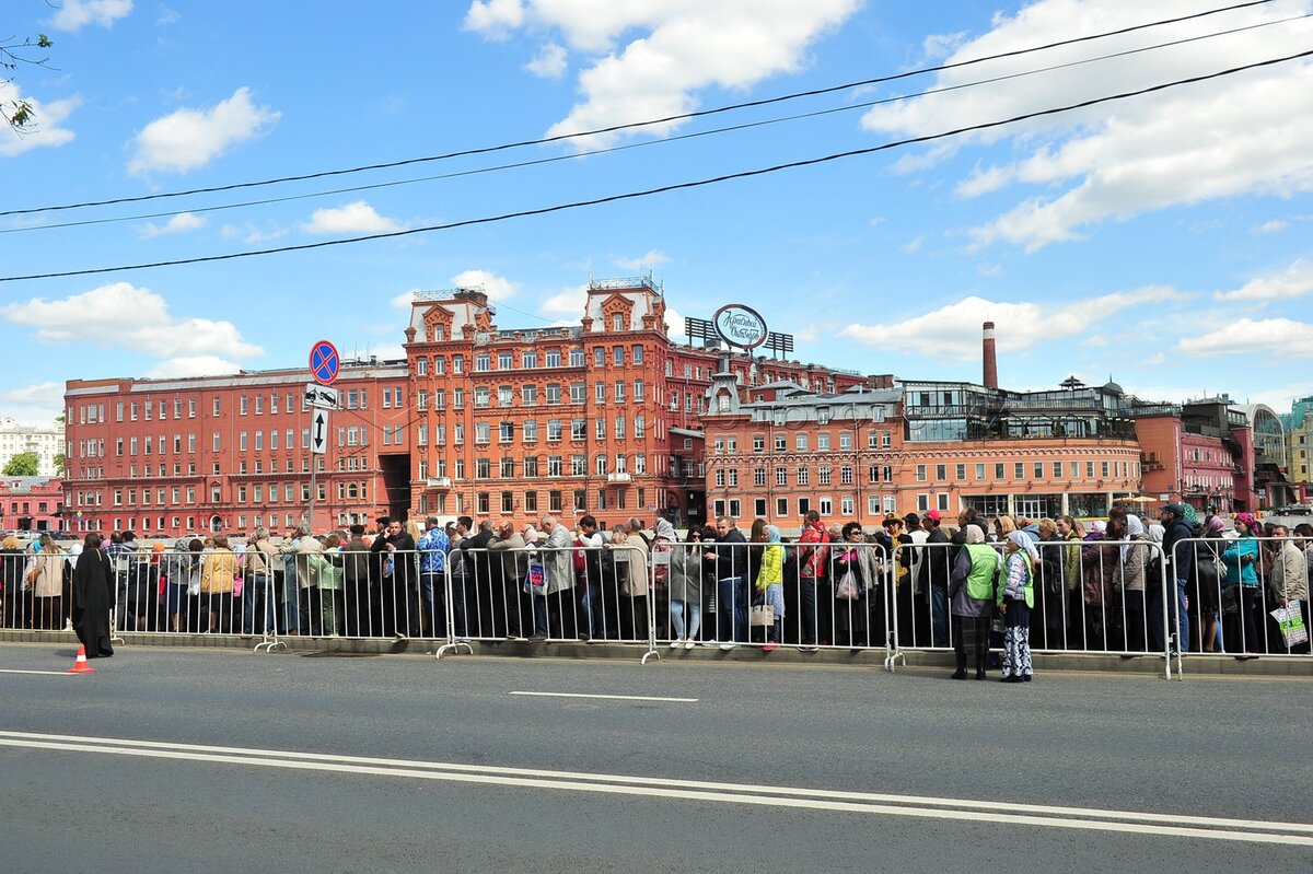 • Заголовок: Верующие в очереди к мощам Николая Чудотворца у храма Христа Спасителя