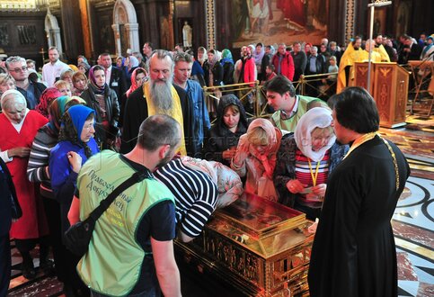 Поклонение верующих мощам святителя Николая Чудотворца в храме Христа Спасителя