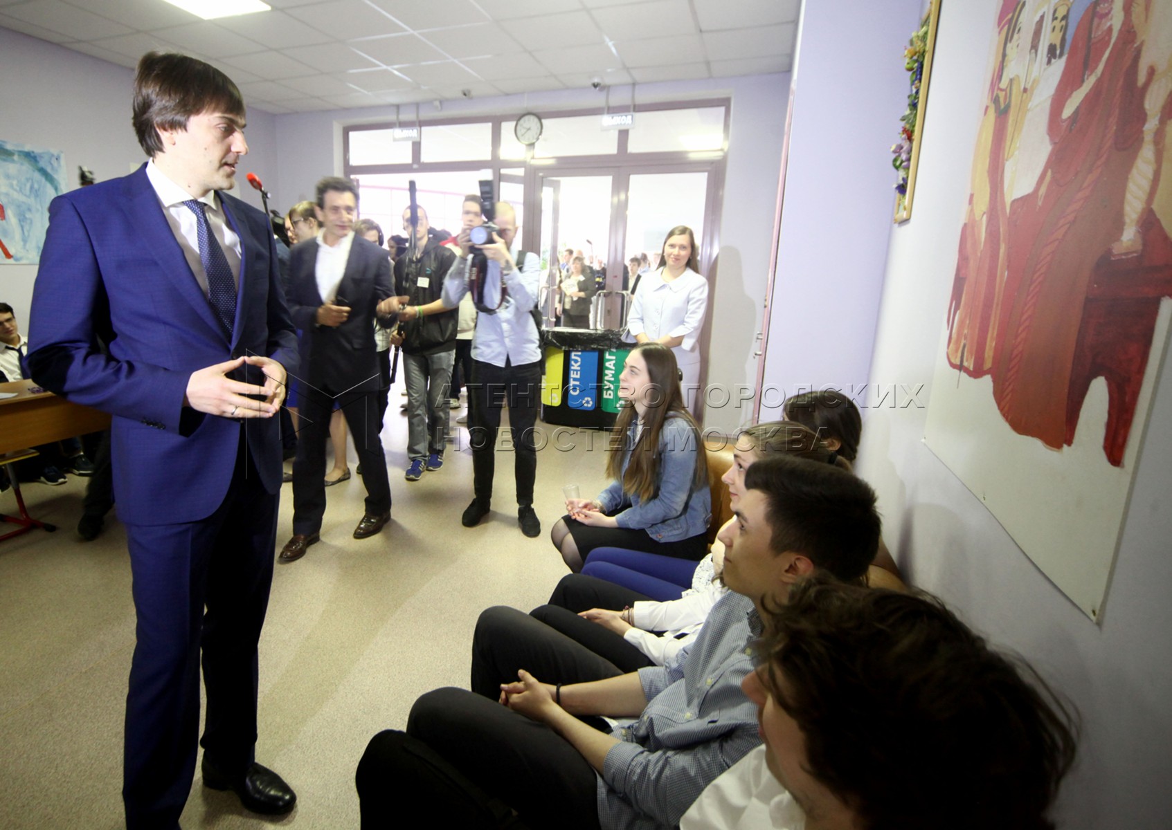 - Описание: Руководитель Федеральной службы по надзору в сфере образования и науки Сергей Кравцов перед началом проведения ЕГЭ по русскому языку в средней общеобразовательной школе №152.
