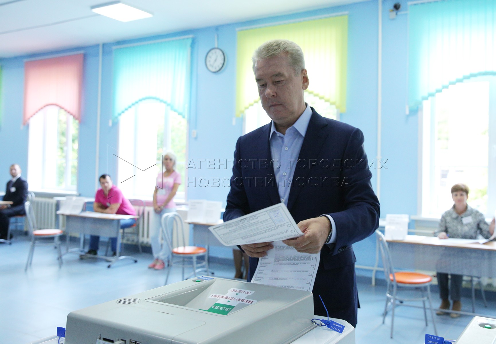 С.Собянин на выборах муниципальных депутатов столицы на избирательном участке, ра...