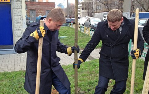 • Описание: Руководитель департамента природопользования и охраны окружающей среды Москвы Антон Кульбачевский (слева) во время высадки деревьев и кустарников в рамках акции «Миллион деревьев».