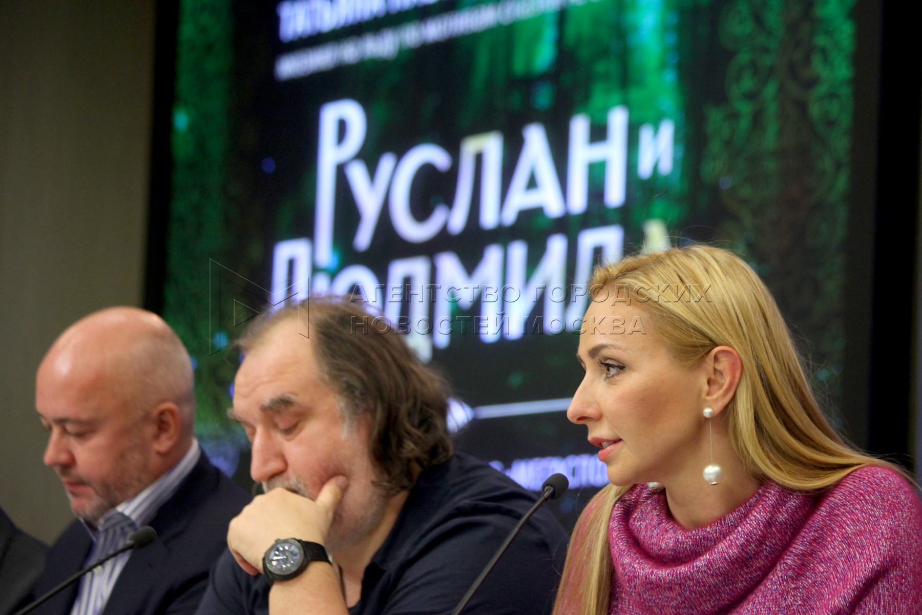 - Описание: Cопродюсер шоу, генеральный директор компании Eventica Сергей Колушев, режиссер-постановщик Алексей Сеченов, автор идеи, продюсер, исполнительница роли Людмилы, олимпийская чемпионка в танцах на льду Татьяна Навка (слева направо) во время пресс-конференции, посвященной премьере мюзикла на льду «Руслан и Людмила»