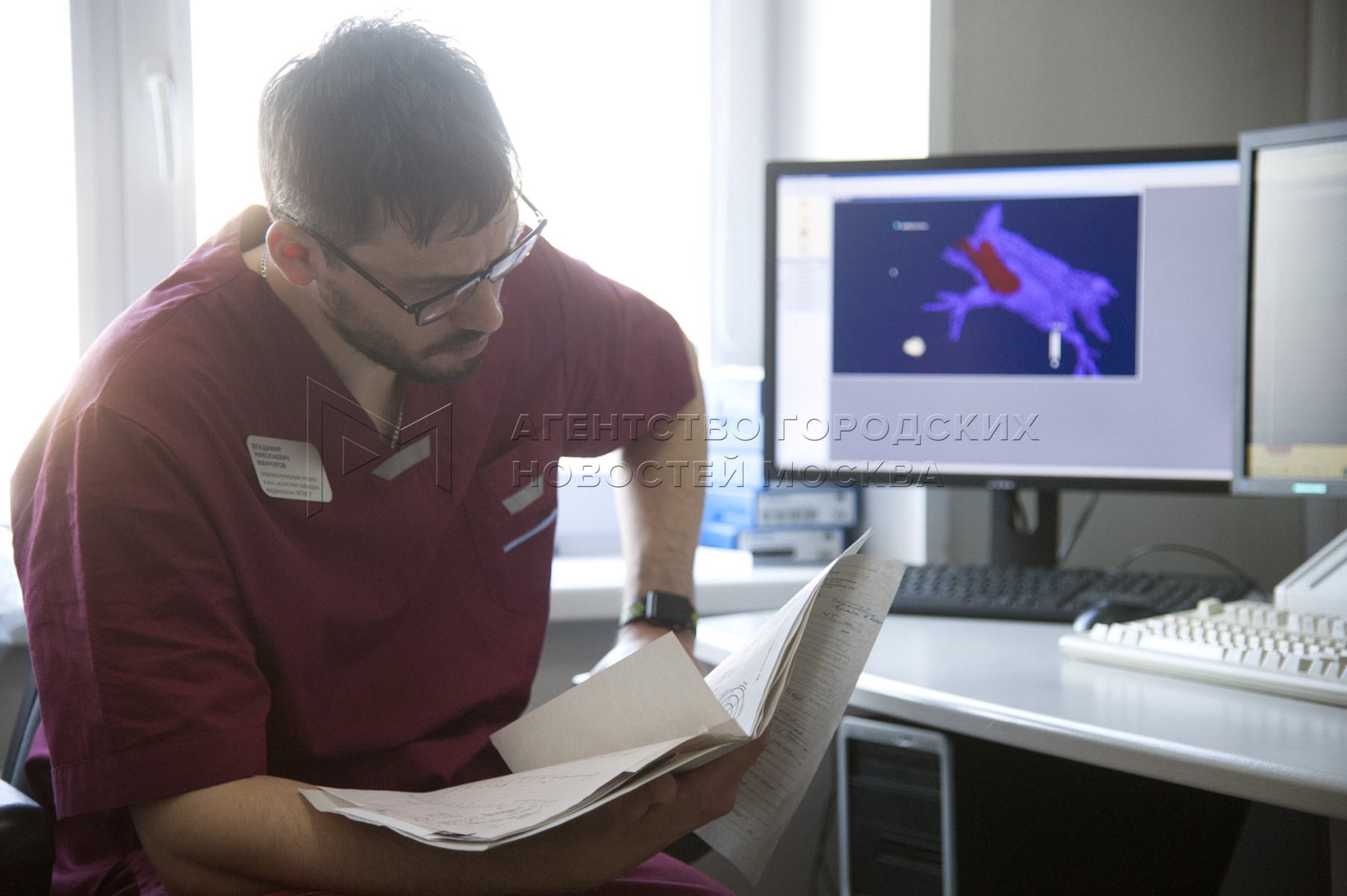 Эндоваскулярный хирург Владимир Манчуров показывает на мониторе снимок коронарной...