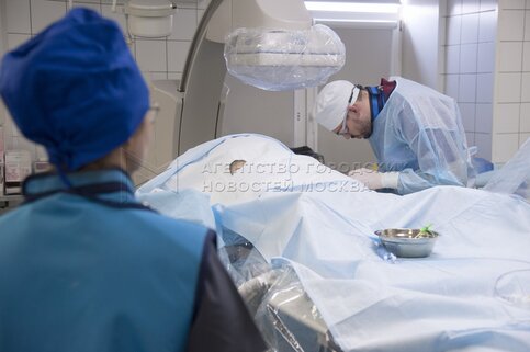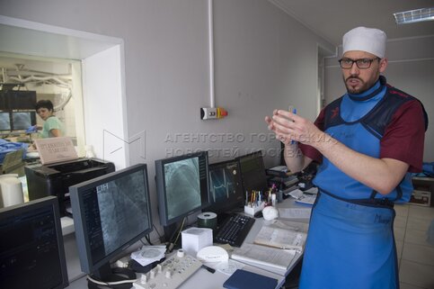 Эндоваскулярный хирург Владимир Манчуров во время операции чрескожного коронарног...